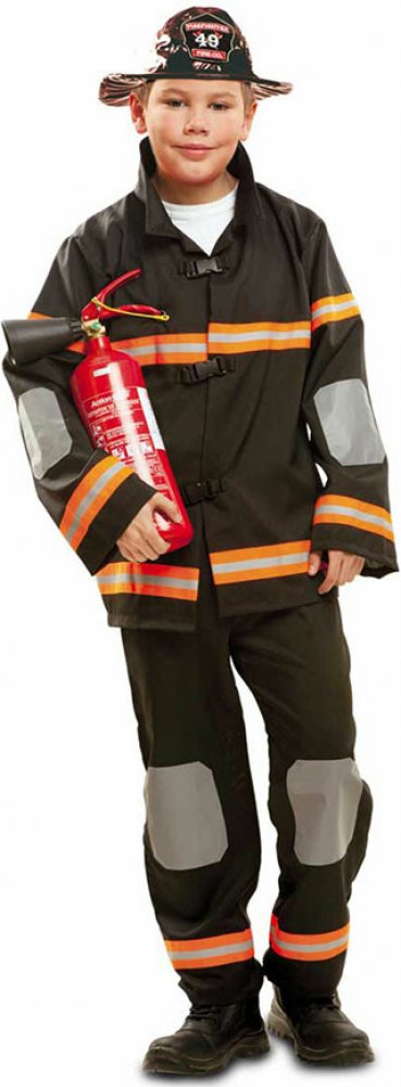 Černý žaket má přes hrudník i dlouhé rukávy dva reflexní oranžovo-stříbrné proužky. Na rukávech u loktů a na nohavicích v oblasti kolen jsou šedé obdélníky. Na nohavicích ve spodní části jsou také reflexní proužky. Žaket se zapíná na černé přezky. Kostým doplňuje černá čepice se znakem ve tvaru hasičské helmy.