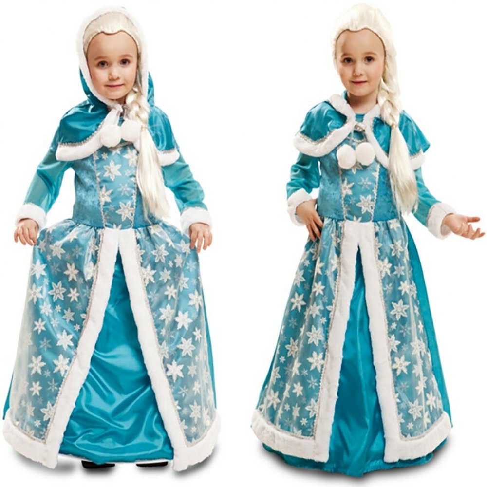 Dlouhé modré šaty mají dlouhé mírně průhledné rukávy na spodním lemu zdobené proužkem bílé chlupaté látky a stříbrnou stužkou. Na hrudníku je modrý samet. Středem hrudníku je na modré látce přišila průhledná bílá stříbrně lemovaná vsadka potištěná stříbrnými vločkami. Ze stejné látky je i vrchní sukně v přední části šatů, která má uprostřed rozparek až k pasu a je lemovaná širším chlupatým bílým pruhem látky a stříbrnou stužkou. Spodní sukně je modrá. Kostým doplňuje malý modrý plášť s kapucí. Kapuce a přední část pláště je také lemovaná bílou chlupatou látkou a stříbrnou stužkou. Plášť se zavazuje na stříbrnou stužku, která má na koncích přišity bílé bambule.