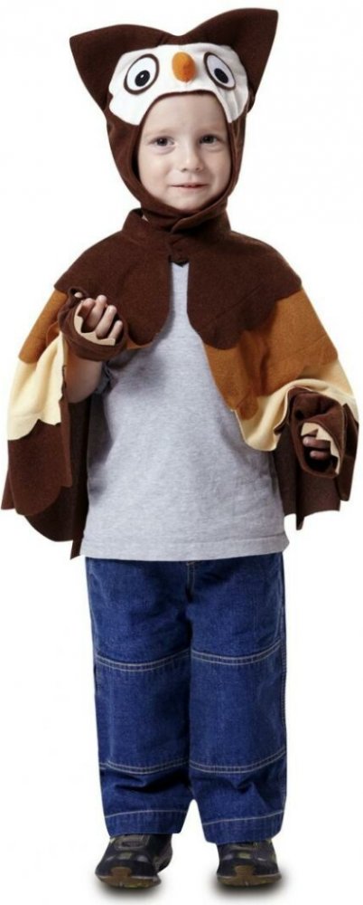 Hnědý plášť je na suchý zip pod krkem. 4 široké pruhy na plášti jsou různých hnědých odstínů a jsou vrstvené na sebe. Tmavohnědé rukavice bez prstů mají přišit cípatý proužek světlejší hnědé tvořící dojem drápků. Tmavohnědá čepice je na suchý zip a má uši, velké soví oči a oranžový zobáček.