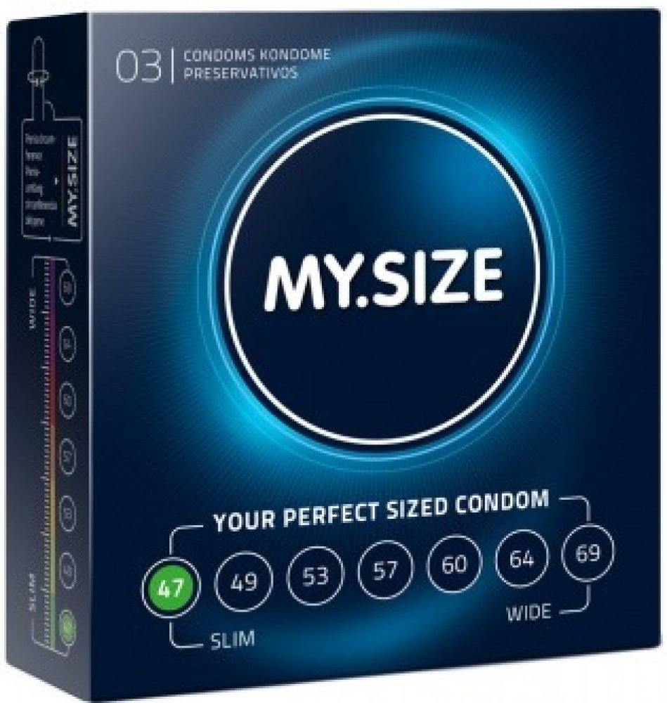 Kondomy německé značky MySize jsou vyráběny v různých velikostech, takže vždy najdete perfektně padnoucí kondom. Nosit správně nasazený kondom je nejen příjemnější, ale také zvyšuje bezpečnost během používání. Tyto kondomy o šířce 47 mm mají průměr s následujícími rozměry:
