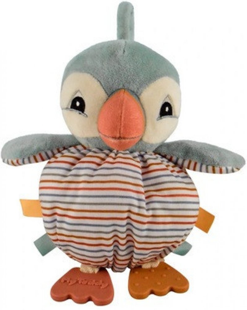 Měkké kulaté tělíčko má po stranách cedulky pro procvičování jemné motoriky miminek. Nožičky jsou ze silikonu a pomáhají ulevit od bolesti při růstu prvních zubů. V křídlech je uvnitř šustící papír.