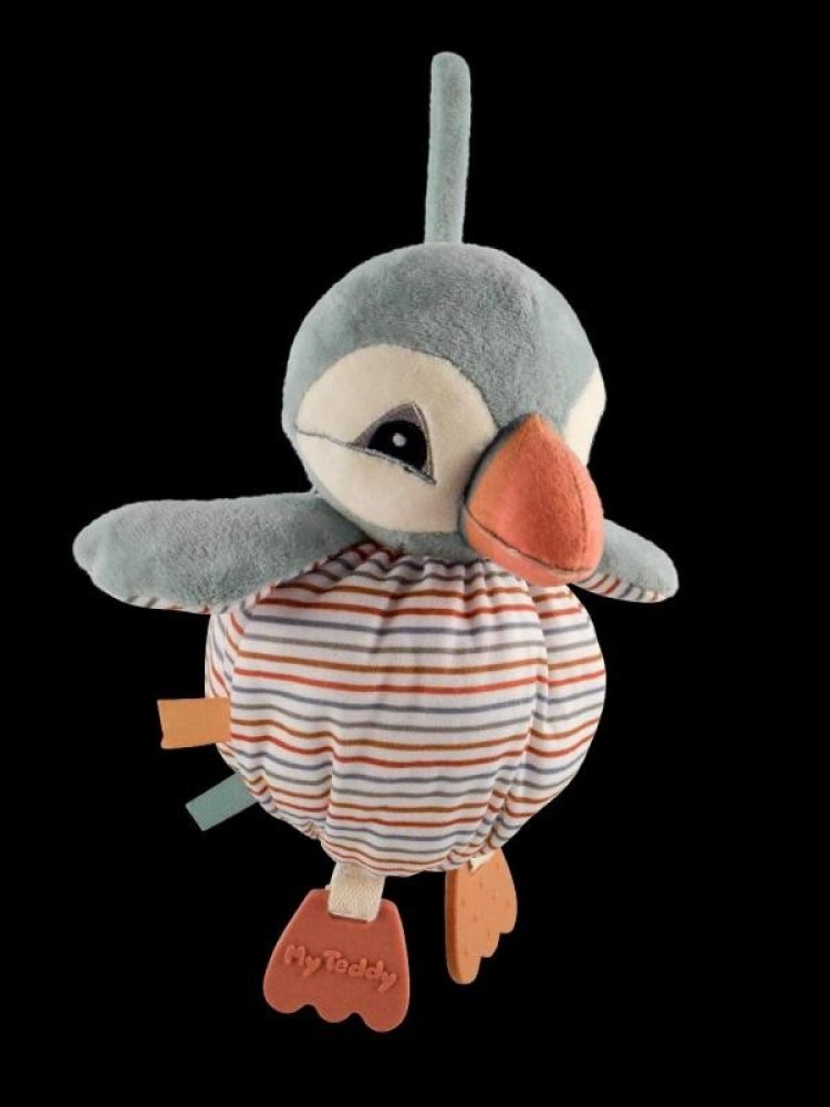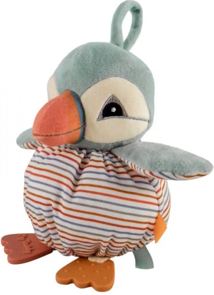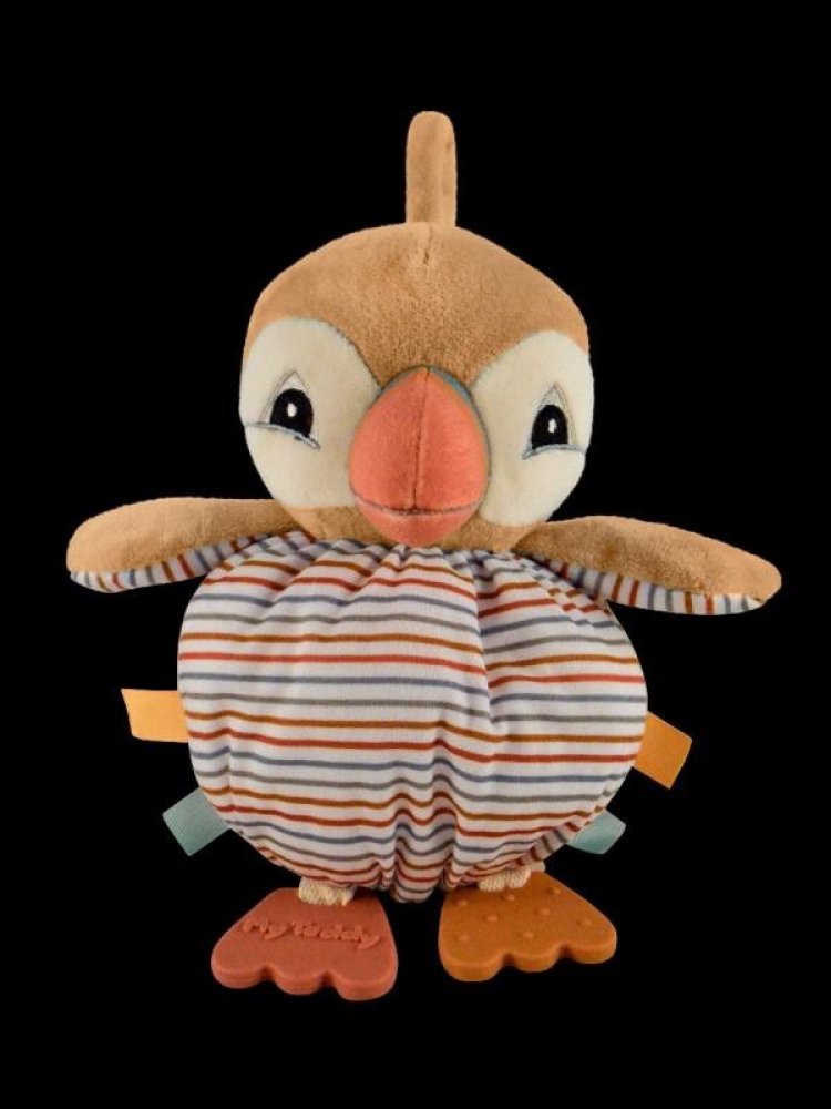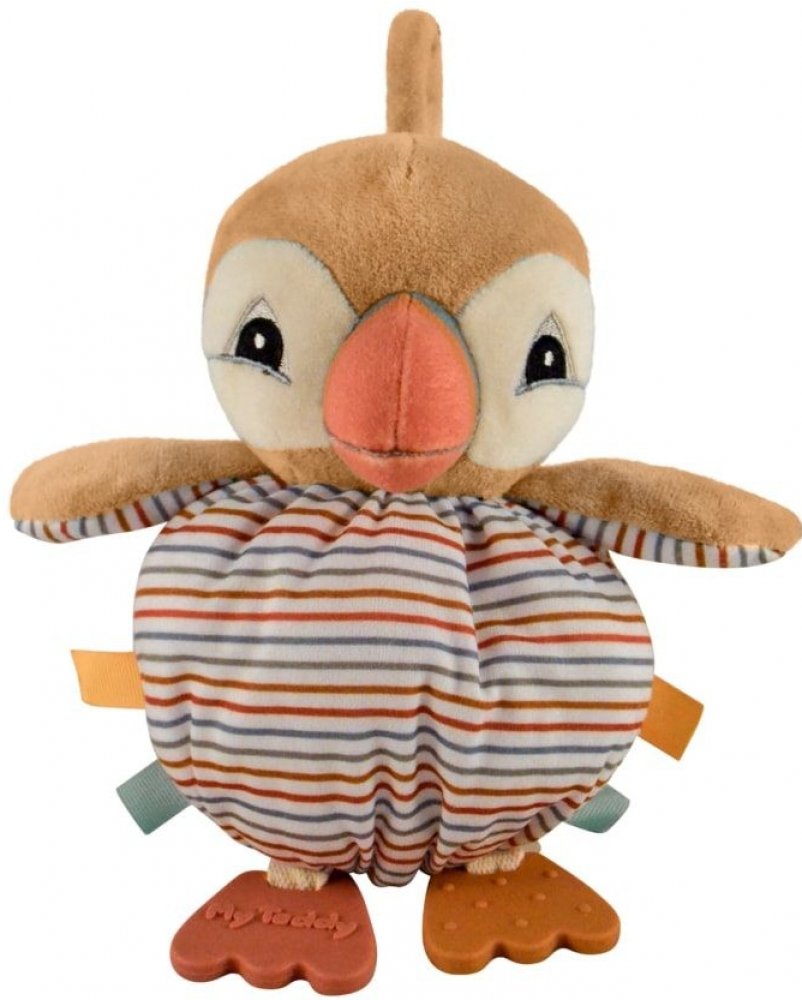 Měkké kulaté tělíčko má po stranách cedulky pro procvičování jemné motoriky miminek. Nožičky jsou ze silikonu a pomáhají ulevit od bolesti při růstu prvních zubů. V křídlech je uvnitř šustící papír.