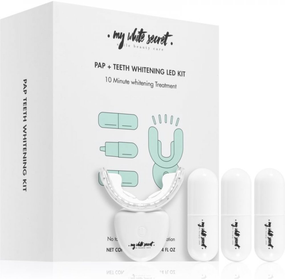 Dopřejte si zářivý úsměv s bělící sadou My White Secret, která kombinuje šetrnost a účinnost moderní technologie. Tato sada zahrnuje LED náústek, USB nabíječku a tři nádobky s inovativním PAP+ bělícím gelem. Je ideální pro ty, kteří hledají efektivní a bezpečný způsob, jak si vybělit zuby z pohodlí domova.Použití je rychlé a snadné – celá aplikace zabere pouhých 10 minut denně a sada vystačí na in...