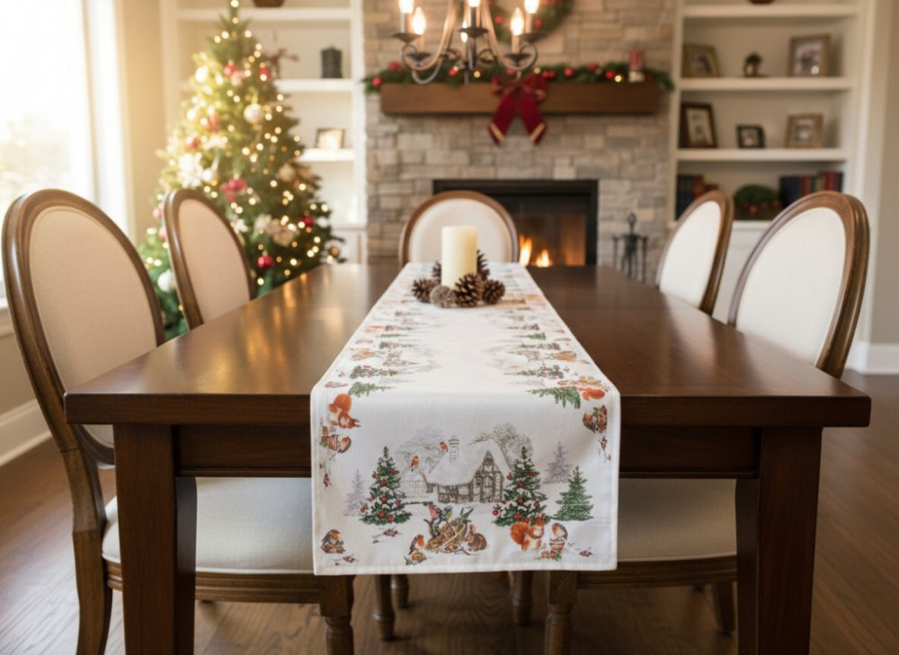 Vánoční ubrusy - běhouny patří k základnímu vybavení každé jídelny. Ubrusy - běhouny na stůl mají spoustu originálních vánočních motivů od hvězdiček, ozdob, sobů, stromečků až po zasněžené chaloupky.