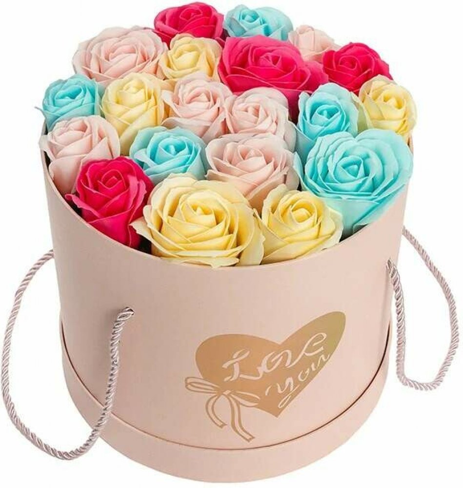 Uvnitř se ukrývá pečlivě aranžovaná kytice složená z tmavě a světle růžových, pastelově modrých a světle žlutých mýdlových růží.