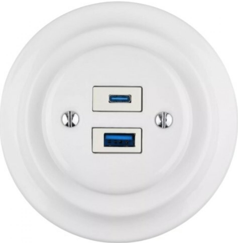Keramická retro zásuvka USB jednonásobná v bílé barvě. 1x USB-C a 1x USB-A určené k nabíjení. Ručně vyráběná z kvalitní keramiky. Ideální do luxusních interiérů, moderních domů, restaurací i roubených chaloupek.