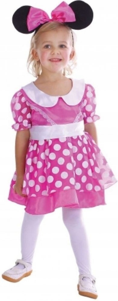 Růžovobílé šaty s krátkými rukávky, zdobený puntíky a bílým límcem, čeká na holky, které by rády vyrazili na karneval jako myšky.