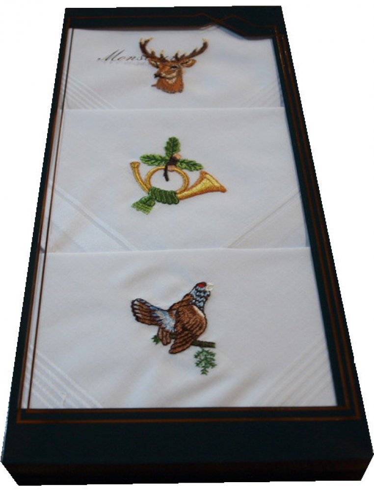 Kvalitní bavlněné kapesníky balené po třech kusech v krabičce. Kapesníky jsou vyrobeny z česané bavlny, rozměr kapesníků je klasický cca 40x40cm.