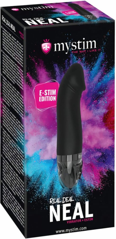 Objev elektro-stimulaci s drážděním G-bodu - špičkový požitek a posilování pánevního dna v jednom přístroji!Proč je to super?Příjemný, sametový silikon: Jemný i k citlivým intimním partiím.Anatomicky tvarovaná hlavice: Dokonale padne na G-bod pro přesnou stimulaci.8 vibračních rytmů: Různorodé, vzrušující zážitky.5 E-Stim programů s 10 úrovněmi intenzity: Od jemného šimrání až po svalové stahy - přizpůsobíš si vše podle chuti.Funkce tréninku pánevního dna: Diskrétně posiluje Kegelovy svaly, klidně i na cestách.Oddělené ovládání funkcí: Vibrace i elektro-stimulaci můžeš používat zvlášť.Ovladač s diamantovým vzorem: Stylový vzhled, prémiový pocit.Vestavěná baterie: Nabíjecí, nepotřebuješ žádné baterie.Zámek tlačítek: Na cestách se náhodně nezapne.Tichý provoz: Maximálně diskrétní použití.Na co dát pozor:Používej jen lubrikant na vodní bázi: Pro ochranu materiálu a bezpečnost.Před i po použití vždy umýt: Doporučujeme dezinfekci.Elektro část nesmí přijít do styku s vodou: Není vodotěsný.Skladuj odděleně: Nenechávej v kontaktu s jinými hračkami.Nedoporučeno: Osobám se srdečními problémy a těhotným.Jak používat?Po aplikaci lubrikantu: Vlož do vagíny tak, aby ovladač směřoval ven.Použití: Začni jemně, postupně zasouvej a aktivuj si vybrané funkce dle chuti.Stimulace: E-Stim funkce vyvolává mravenčení a lehké svalové kontrakce.Ovládání:Kruh: Zapnutí/vypnutí vibrací, změna režimu.Šipka: Aktivace E-Stim, přepínání programů.+ / - tlačítka: Nastavení intenzity E-Stim v 10 stupních.Zámek: Držením tlačítek kruhu a šipky současně aktivuješ/deaktivuješ zámek tlačítek.Zelená LED: Aktivní režim cvičení pánevního dna.Připojení nabíječky:Magnetické USB nabíjení: Rychlé a pohodlné nabíjení přiloženým kabelem.Nabíjecí kontakty: Na těle přístroje na opačné straně ovládacích tlačítek - dvě kovové tečky.Balení obsahuje:1x Mystim Neal elektro G-bod vibrátor1x magnetický USB nabíjecí kabelVlastnosti produktu:Materiál: Silikon, ABS (bez ftalátů, splňuje směrnice EU)Barva: ČernáCelková délka: 17 cmVložitelná délka: 12 cmMaximální průměr: 3,6 cmFunkce: 8 vibračních režimů, 5 E-Stim programů, 10 úrovní intenzity, stimulace G-bodu, trénink pánevního dnaOddělené ovládání: Vibrace a E-Stim můžeš spustit zvlášťVestavěná baterie a zámek tlačítek: Praktické, bezpečné, ideální na cestováníDoporučujeme čistit: Omyj jemným mýdlem a vlažnou vodou - dávej pozor, ať se voda nedostane na elektrické části. Ideální použít i antibakteriální čistič (8718627520062) - lze dokoupit samostatně.Mrkni na video prezentaci mystim Real Deal Neal E-Stim - nabíjecí elektro vibrátor (černý)!