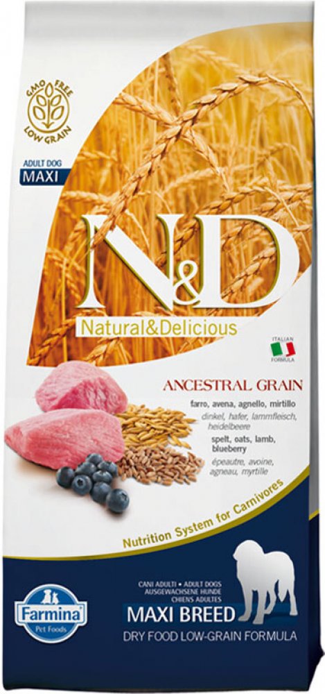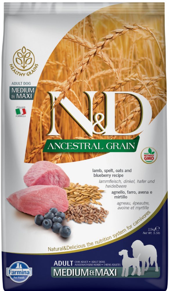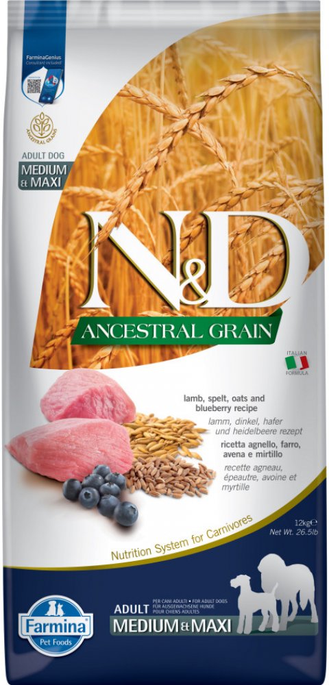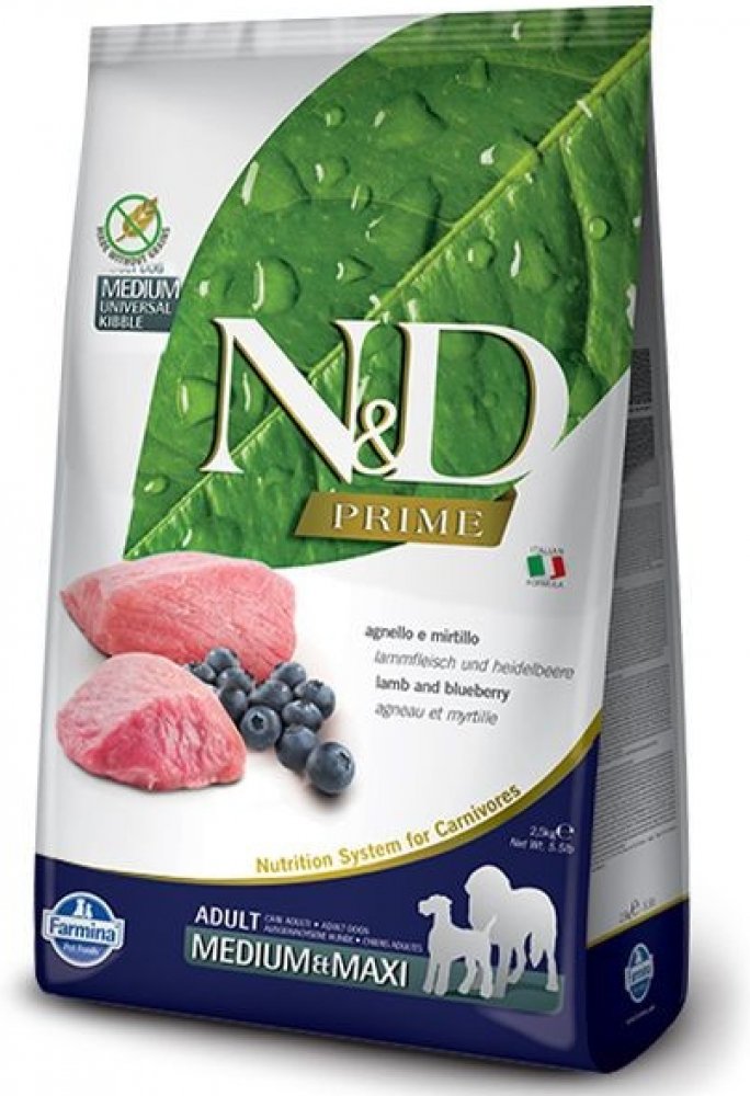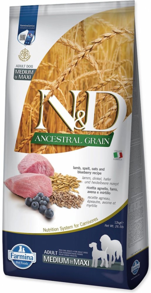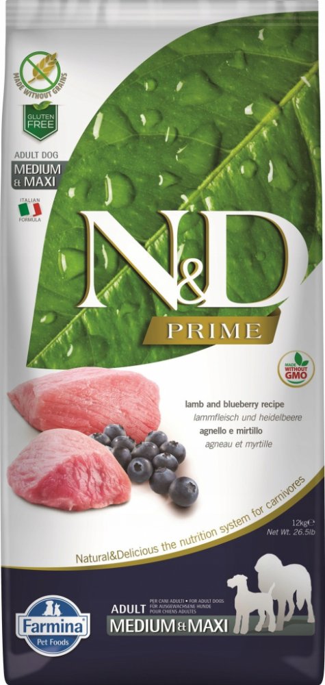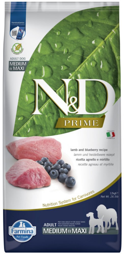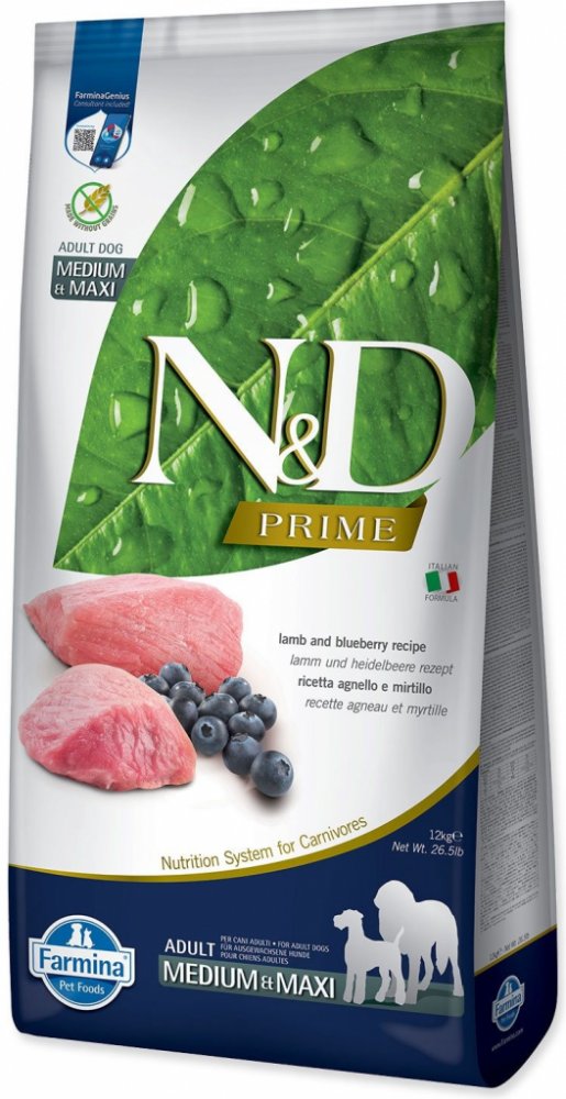 N&D Lamb & Blueberry (Jehně s borůvkami)- canine formula Kompletní krmivo pro dospělé psy. Složení: Čerstvé vykostěné jehněčí (26%), sušené jehněčí maso (25%), brambory, sušená celá vejce, čerstvý herring, sušený herring, živočišný tuk, rybí olej, vláknina z hrášku, sušené mrkve, sušená vojtěška, inulin, fruktooligosacharidy, mannanoligosacharidy, prášek z borůvek (0,5%), sušený sladký pomeranč, s...