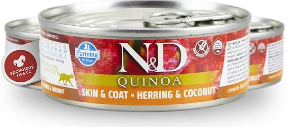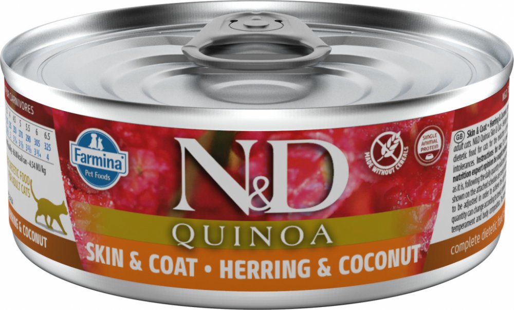 Farmina N&D Quinoa Herring & Coconut je krmivo pro zvláštní účely výživy určené k podpoře omezení intolerance určitých komponentů a živin.