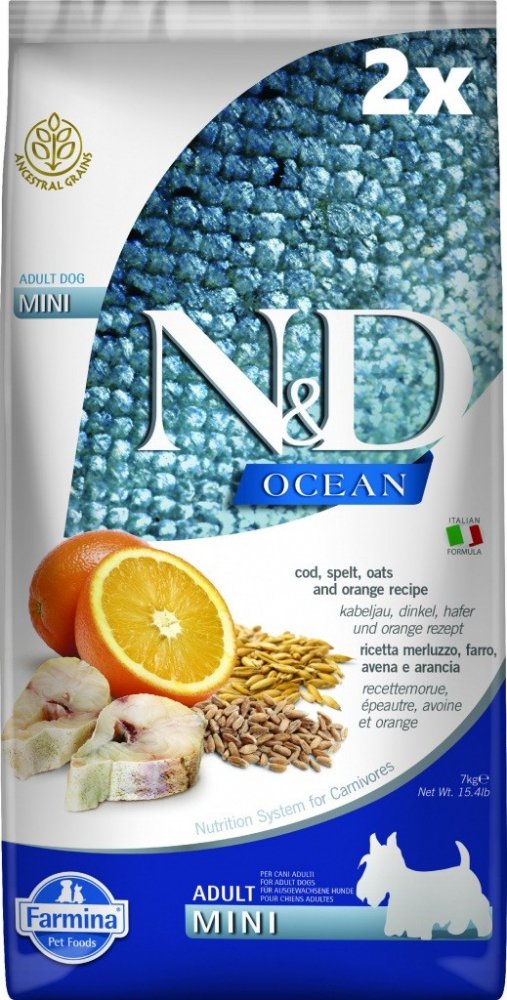 Kompletní suché krmivo s nízkým obsahem obilovin, treskou a pomerančem pro dospělé psy malých plemen. Treska, špalda, oves a pomeranč. Kompletní krmivo pro dospělé psy malých plemen. Složení: Čerstvá treska (24%), sušená treska (24%), rybí olej (ze sledě), špalda (10%), oves (10%), sušené řepné řízky, vláknina z hrášku, sušené mrkve, sušená vojtěška, inulin, fruktooligosacharidy, extrakt z kvasnic (zdroj mannanoligosacharidů), sušený sladký pomeranč (0,5%), sušená jablka, sušené granátové jablko, sušený špenát, psyllium (0,3%), sušené borůvky, chlorid sodný, sušené pivovarské kvasnice, kořen kurkumy (0,2%), extrakt z aloe vera 1000mg. Doplňkové látky na 1kg – nutriční doplňkové látky: Vitamín A 15000MJ; Vitamín D3 1500MJ; Vitamín E 600mg; Vitamín C 150mg; Niacin 37.5mg; kyselina pantothenová 15mg; Vitamín B2 7.5mg; Vitamín B6 6mg; Vitamín B1 4.5mg; Vitamín H 0.38mg; kyselina listová 0.45mg; Vitamín B12 0.1mg; cholin chlorid 2500mg; betakaroten 1.5mg; chelát zinku hydroxy analogu methioninu 910mg; chelát manganu hydroxy analogu methioninu 380mg; chelátová forma železa, hydrát 250mg; chelát mědi hydroxy analogu methioninu 88mg; inaktivované kvasinky obohacené selenem 0.40mg; DL-Metionin 4000mg; Taurin 1000mg; L-karnitin 300mg. Senzorické doplňkové látky: extrakt ze zeleného čaje 100mg, extrakt z rozmarýnu. Antioxidanty: extrakt z vyšším podílem tokoferolu přirozeného původu. Analytické složky: Hrubý protein 30.00%; hrubé tuky a oleje 18.00%; hrubá vláknina 2.90%; vlhkost 9.00%, hrubý popel 6.90%; Vápník 1.20%; Fosfor 0.90%; Omega-6 1.60%; Omega-3 2.30%; DHA 1.00%; EPA 0.70%; Glukosamin 1200mg/kg; Chondroitin sulfát 900mg/kg.
