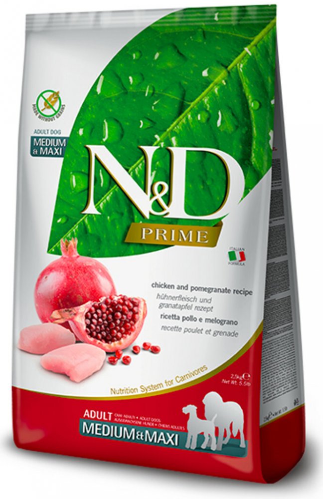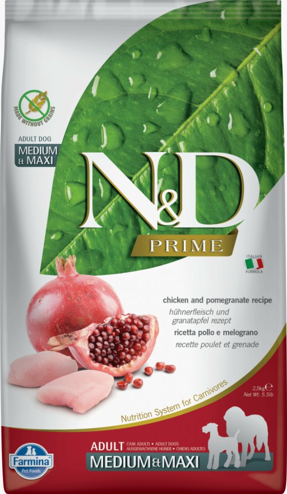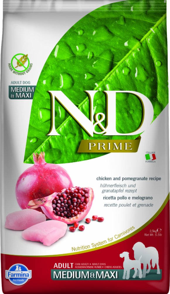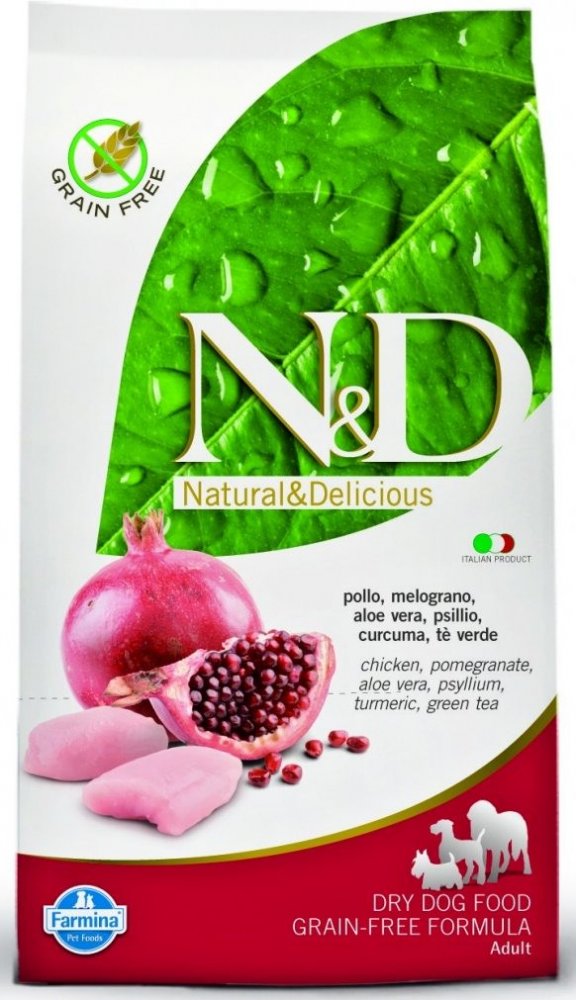 N&D grain free PUMPKIN Dog Adult Mini Chicken & Pomegranate Hrachový škrob, dýně, kuře, granátové jablko. Kompletní krmivo pro dospělé psy malých plemen. Složení: Čerstvé vykostěné kuře (24%), sušené kuřecí maso (22%), hrachový škrob (20%), kuřecí tuk, sušená dýně (5%), sušená celá vejce, čerstvý herring, sušený herring, sušená dřeň z červené řepy, rybí olej, vláknina z hrášku, sušené mrkve, sušená vojtěška, inulin, fruktooligosacharidy, mannanoligosacharidy, prášek z granátového jablka (0.5%), sušená jablka, prášek ze špenátu, psyllium (0.3%), prášek z černého rybízu, sušený sladký pomeranč, prášek z borůvek, chlorid sodný, sušené pivovarské kvasnice, kořen kurkumy (0.2%), glukosamin, chondroitin sulfát, extrakt z afrikánu (zdroj luteinu). Aditiva na 1 kg. Výživové přísady: Vitamín A 15000IU; Vitamín D3 1500IU; Vitamín E 600mg; Vitamín C 150mg; Niacin 37.5mg; kyselina panthotenová 15mg; Vitamín B2 7.5mg; Vitamín B6 6mg; Vitamín B1 4.5mg; Vitamín H 0.38mg; kyselina listová 0.45mg; Vitamín B12 0.1mg; cholin chlorid 2500mg; Beta-karoten 1.5mg; chelát zinku analogické metioninové hydrolázy 910mg; chelát manganu analogické metioninové hydrolázy 380mg; chelát železa analogické metioninové hydrolázy 250mg; chelát mědi analogické metioninové hydrolázy 88mg; selenometionin 0,40mg; DL-Metionin 4000mg; taurin 1000mg; L-karnitin 300mg. Organoleptické přísady: Extrakt z aloe vera 1000mg; extrakt ze zeleného čaje 100mg; extrakt z rozmarýnu. Antioxidanty: tokoferol - bohaté výtažky přírodního původu. Analytické složky: Hrubý protein 30.00%; čisté tuky a oleje 18.00%; hrubá vláknina 2.90%; popel 7.00%; Vápník 1.20%; Fosfor 0.90%; Omega-6 3.30%; Omega-3 0.90%; DHA 0.50%; EPA 0.30%; Glukosamin 1200mg/kg; Chondroitin 900mg/kg. Energetická hodnota: ME 3800kcal/kg - 15.9MJ/kg. Návod k použití: viz tabulka. Je doporučeno ze začátku míchat N&D s předchozí používanou stravou. Skladujte na chladném a suchém místě v uzavřeném balení. Vyrobeno 18 měsíců před datem spotřeby vytištěným na balení. Vyrobeno převážně ze surovin pocházejích z Itálie, Dánska a Francie. Net hmotnost, datum spotřeby, šarže a registrační číslo jsou uvedeny na zadní části obalu.