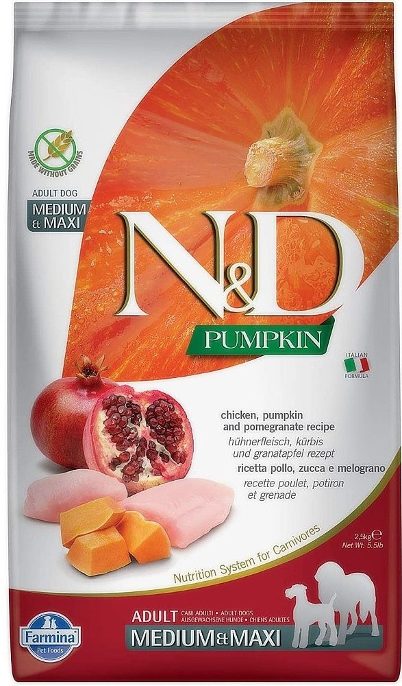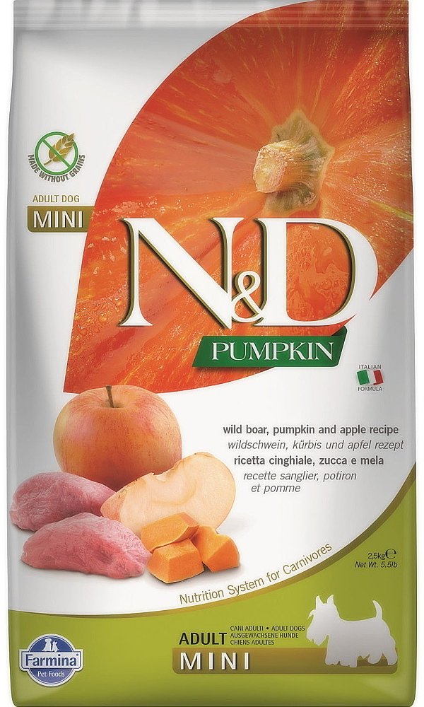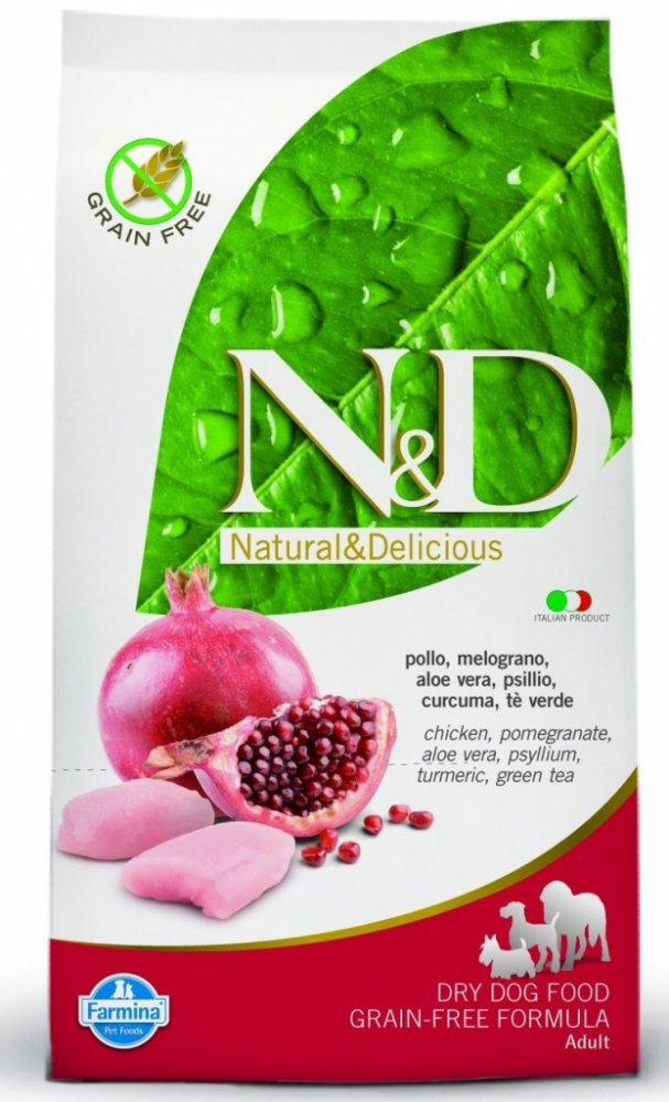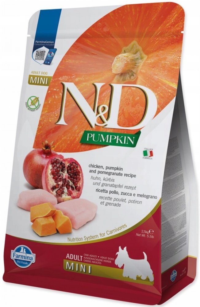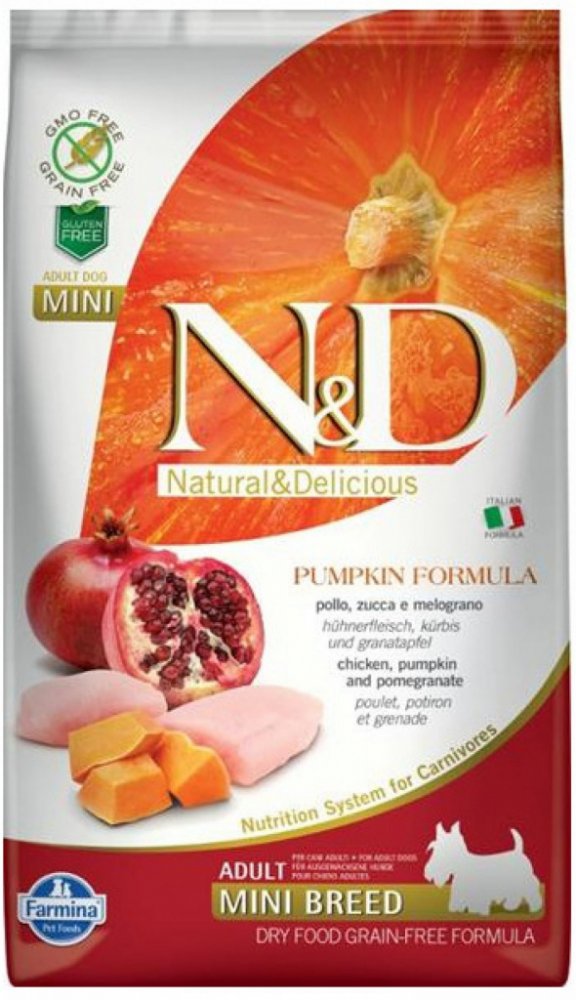 N&D grain free PUMPKIN Dog Adult Mini Chicken & Pomegranate Hrachový škrob, dýně, kuře, granátové jablko. Kompletní krmivo pro dospělé psy malých plemen. Složení: Čerstvé vykostěné kuře (24%), sušené kuřecí maso (22%), hrachový škrob (20%), kuřecí tuk, sušená dýně (5%), sušená celá vejce, čerstvý herring, sušený herring, sušená dřeň z červené řepy, rybí olej, vláknina z hrášku, sušené mrkve, sušen...