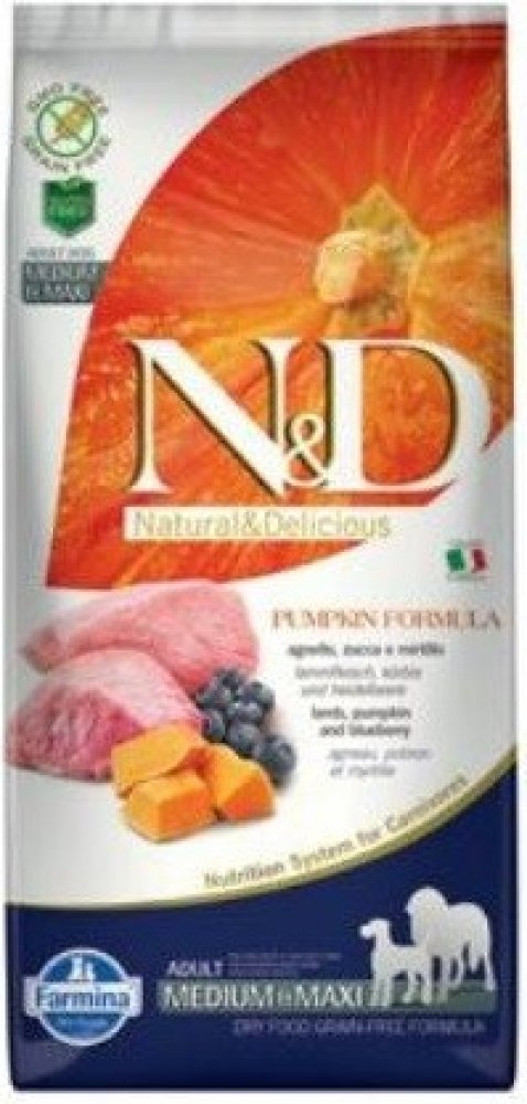 Kompletní krmivo bez obilovin s jehněčím a borůvkami pro dospělé psy středních a velkých plemen. Jehně, dýně a borůvky. Kompletní krmivo pro dospělé psy středních a velkých plemen. Složení: Čerstvé vykostěné jehně (22%), sušené jehněčí maso (20%), hrachový škrob (20%), živočišný tuk, sušená dýně (5%), sušená celá vejce, čerstvý herring, sušený herring, rybí olej, sušená dřeň z červené řepy, vláknina z hrášku, sušené mrkve, sušená vojtěška, inulin, fruktooligosacharidy, mannanoligosacharidy, prášek z borůvek (0.5%), sušená jablka, prášek z granátových jablek, sušený sladký pomeranč, prášek ze špenátu, psyllium (0.3%), prášek z černého rybízu, chlorid sodný, sušené pivovarské kvasnice, kořen kurkumy (0.2%), glukosamin, chondroitin sulfát, extrakt z afrikánu (zdroj luteinu). Doplňkové látky na 1 kg - nutriční doplňkové látky: Vitamín A 15000IU; Vitamín D3 1500IU; Vitamín E 600mg; Vitamín C 150mg; Niacin 37.5mg; kyselina panthotenová 15mg; Vitamín B2 7.5mg; Vitamín B6 6mg; Vitamín B1 4.5mg; Vitamín H 0.38mg; kyselina listová 0.45mg; Vitamín B12 0.1mg; cholin chlorid 2500mg; Beta-karoten 1.5mg; chelát zinku analogické metioninové hydrolázy 910mg; chelát manganu analogické metioninové hydrolázy 380mg; chelát železa analogické metioninové hydrolázy 250mg; chelát mědi analogické metioninové hydrolázy 88mg; selenometionin 0,4mg; DL-Metionin 4000mg; Taurin 1000mg; L-karnitin 300mg. Organoleptické přísady: Extrakt z aloe vera 1000mg; extrakt ze zeleného čaje 100mg; extrakt z rozmarýnu. Antioxidanty: tokoferol - bohaté výtažky přírodního původu. Analytické složky: Hrubý protein 28.00%; čisté tuky a oleje 18.00%; hrubá vláknina 2.90%; popel 8.60%; Vápník 1.40%; Fosfor 1.10%; Omega-6 3.30%; Omega-3 0.90%; DHA 0.50%; EPA 0.30%; Glukosamin 1200mg/kg; Chondroitin 900mg/kg. Energetická hodnota: ME 3740kcal/kg - 15.7MJ/kg.