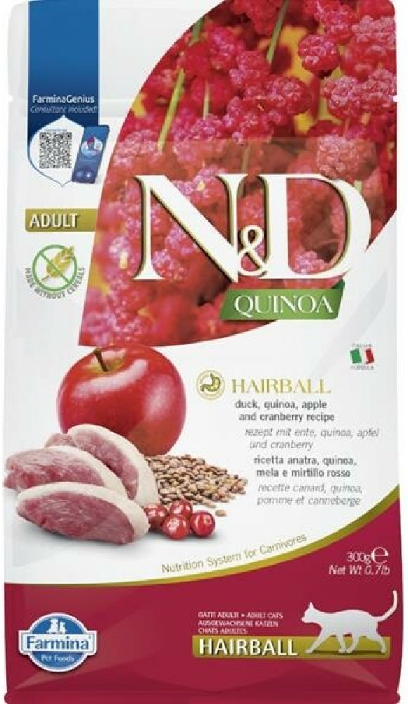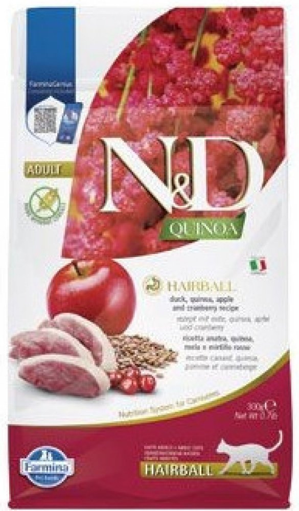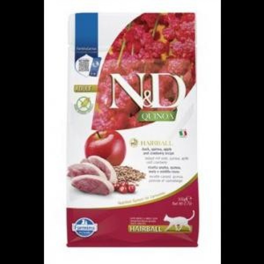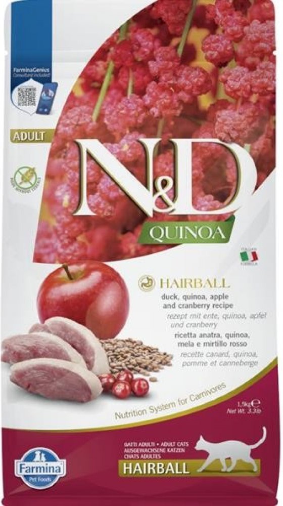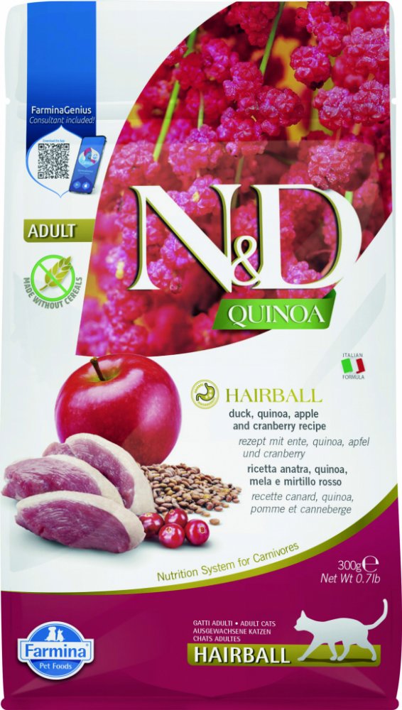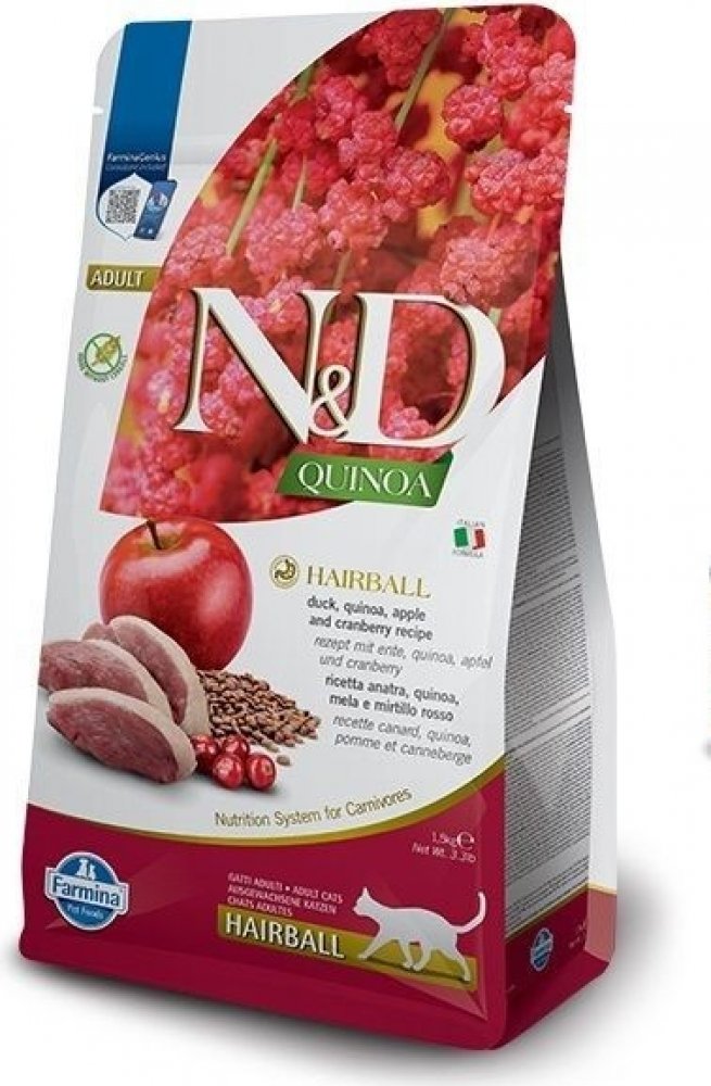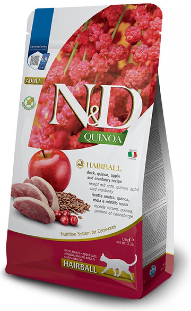N&D Quinoa Hairball je kompletní krmivo pro dospělé kočky, určené k usnadnění vstřebání trichobezoárů.