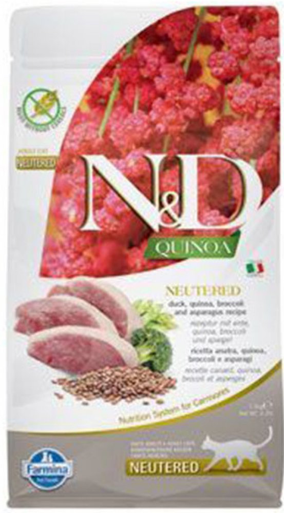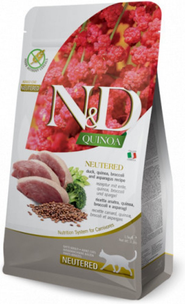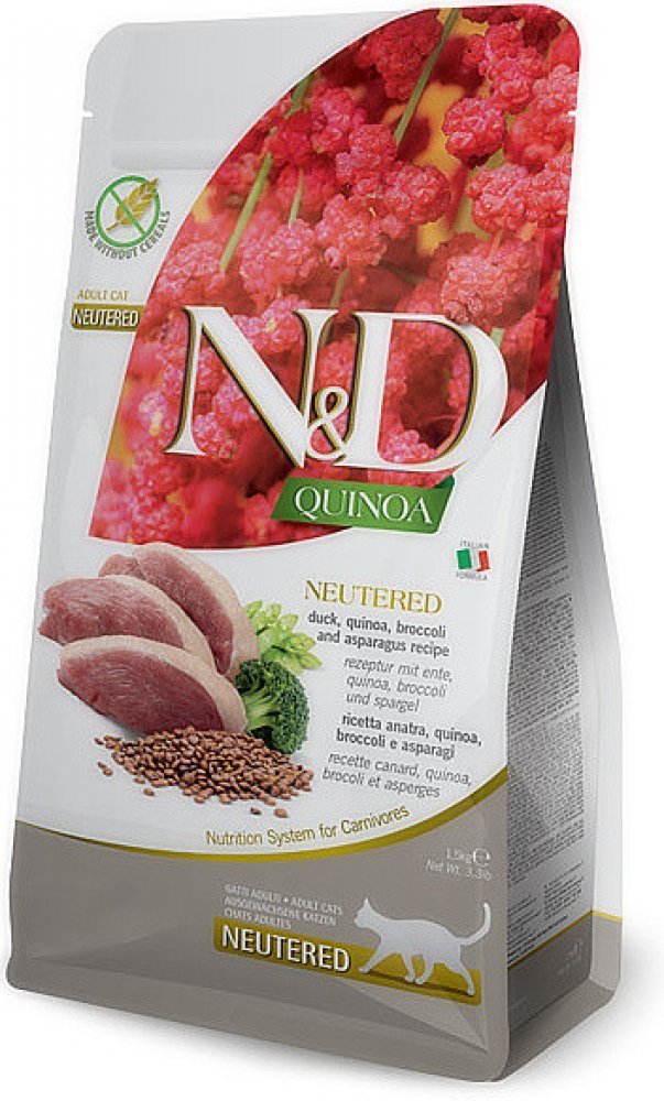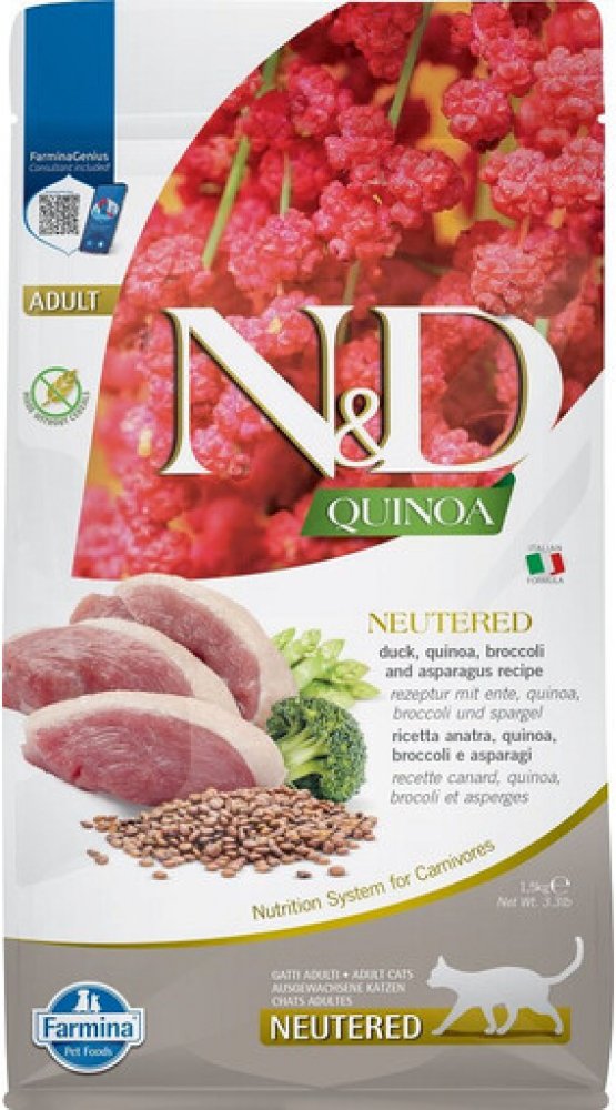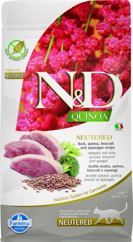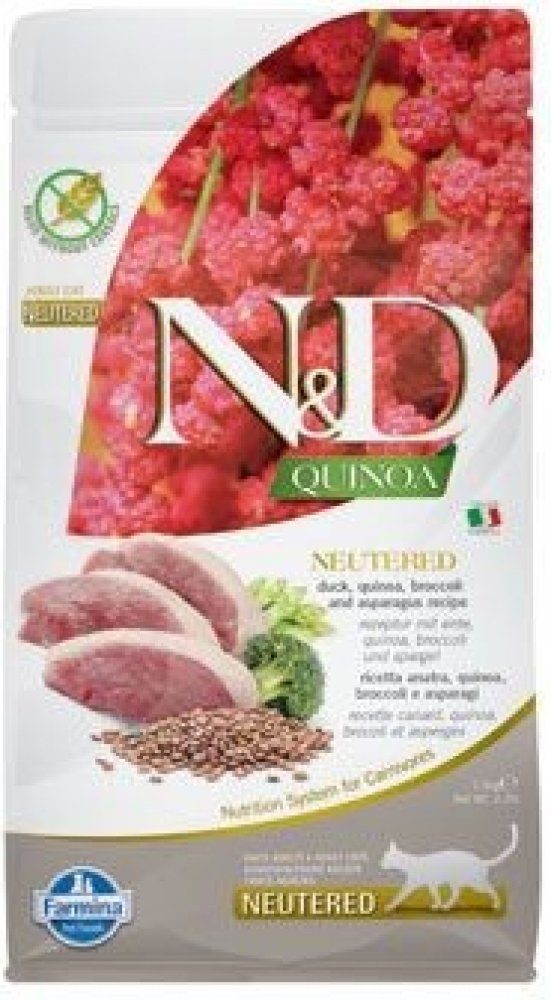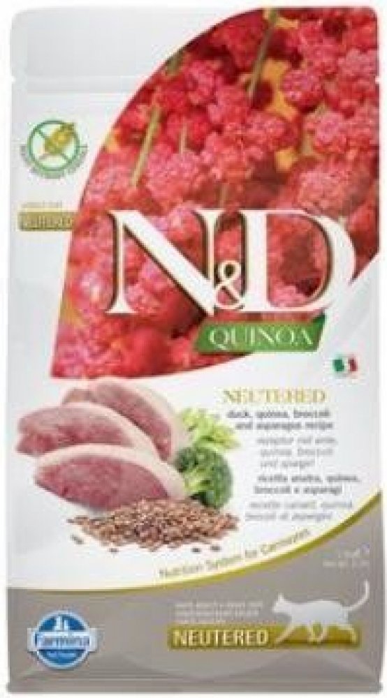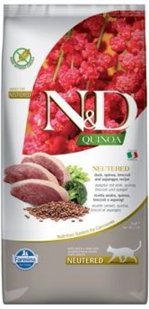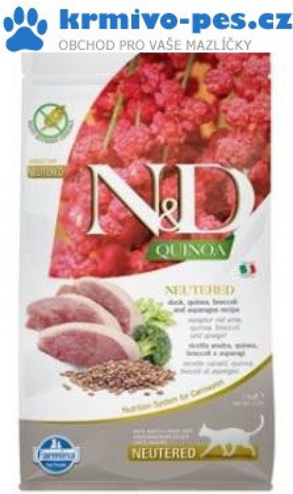 N&D Quinoa CAT NEUTERED Duck & Broccoli & Asparagus Kachna, quinoa, brokolice, chřest. Kompletní vyvážené krmivo pro dospělé kastrované kočky. Farmina N&D Quinoa NEUTERED je kompletní vyvážené krmivo pro dospělé kastrované kočky.