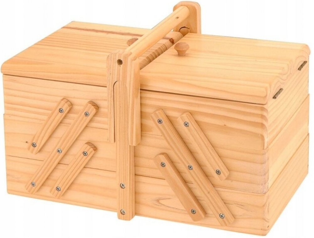 Klasický box na šicí potřeby vyrobený z světlého dřeva pojme všechny Vaše šicí potřeby nebo jiné drobné předměty. Kromě nití, jehel a knoflíků to může být skvělé místo pro uložení šperků, drobných dárků, pohlednic a dokonce i na kosmetiku. Je velmi prostorný - obsahuje 5 samostatných přihrádek: čtyři čtvercové po bocích a jednu velkou obdélníkovou na dně. Můžete jej otevřít jedním pohybem ruky. Masivní držadlo pro snadné přenášení. Čisté dřevo ze kterého je box vyroben, je vhodné ke zdobení pomocí decoupage techniky. Vlastnosti produktu: