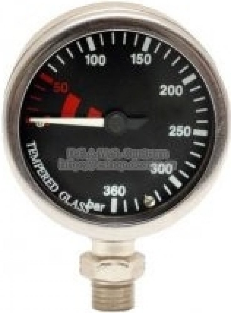 Kvalitní kovový manometr s černou stupnicí a tělem z niklované mosazi. Tvrzené minerální sklo, pracovní tlak 300Bar. Manometr se prodává včetně osičky k hadici. Průměr 52mm. V noci, ve vraku, jeskyňi atd. na něj vždy výborně uvidíte. Mít přehled o svém stavu plynu je v potápění to nejdůležitější!