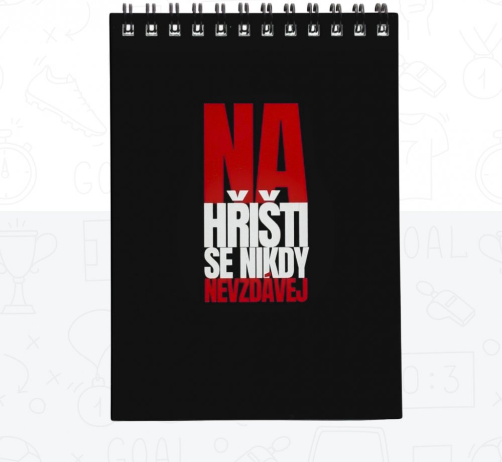 Poznámkový blok „NA HŘIŠTI SE NIKDY NEVZDÁVEJ“ A6 je skvělý společník pro mladé fotbalisty a studenty, kteří chtějí mít své tréninky, zápasy i školní poznámky pohromadě. Malý formát s kroužkovou vazbou nahoře a rovnými rohy umožňuje pohodlné zapisování a snadné nošení. Pevná obálka z 350 g matné křídy chrání všechny zápisky a čistý papír uvnitř poskytuje prostor pro nápady, nákresy i poznámky. Černý design s červeně zvýrazněnými slovy „NA HŘIŠTI“ a „nevzdávej“ je hravý a motivující – ideální pro každodenní inspiraci.