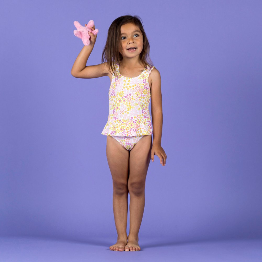 Jednodílné plavky s potiskem, širokými ramínky a slušivou mašličkou na zádech. Plavky, které se navlékají přes hlavu díky zapínání na druky v rozkroku. Ideální pro nejmenší děti do 24 měsíců.
