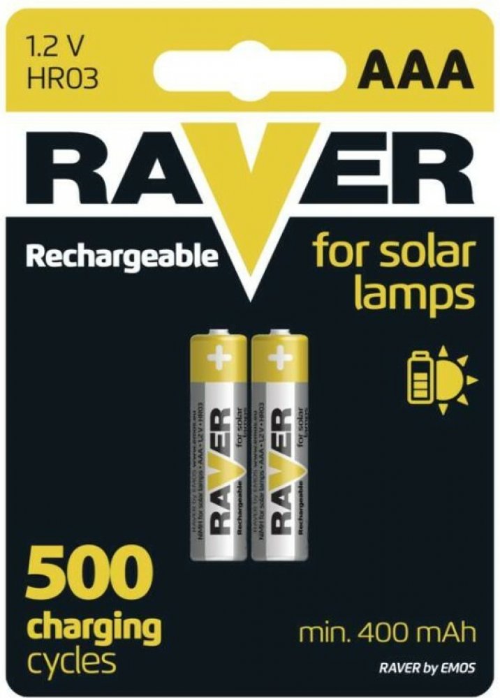 chemické složení: NiMH|hmotnost: 9 g|kapacita: 400 mAh|kategorie/řada: Solar|max. skladovatelnost: neuvádí se|možnost nabíjení: ano|napětí: 1,2 V|počet nabíjecích cyklů: více než 500|prodejní obal: 2 ks, blistr|provozní teplota: -20 °C až +50 °C|rozměr: 10,5 × 44,5 mm|typ: HR03 (mikrotužka, AAA)|velikost baterie: AAA|značka: Raver