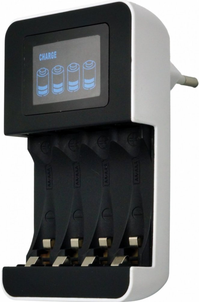 Zásuvková nabíječka pro 1-4 NiMH akumulátory AA nebo AAA, nabíjení řízené mikroprocesorem, ochrana proti přebíjení a přehřátí akumulátorů, 4 individuální nabíjecí sloty, každý akumulátor je monitorován a nabíjen samostatně, možnost nabíjení akumulátorů různého typu a kapacity současně, podsvícený LCD displej s grafickým zobrazením průběhu nabíjení, automatické ukončení nabíjení pomocí detekce Delta-U, bezpečnostní časová pojistka, detekce vadných akumulátorů, ochrana proti nesprávné polaritě, nabíjecí proud: pro AA baterie 450 mA, pro AAA 200 mA, doba nabití akumulátoru 2000 mAh 4,5 h, napájení 100-240 V/50 Hz, dododáváno bez baterií.