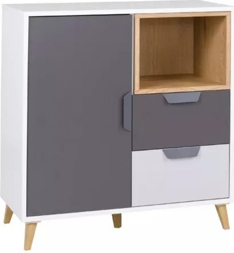 Komoda Poker R9 je vyrobena z lamina v krásném dekoru bílá, grafit, šedá a dub Lefkas. Lamino je odolné a jistě oceníte i snadnou údržbu. Komoda je velmi praktická, kombinace dvířek, polic a šuplíků jistě pojme vše potřebné. Komoda je dodávána v demontu. Součástí balení je montážní návod včetně všech spojovacích prvků.