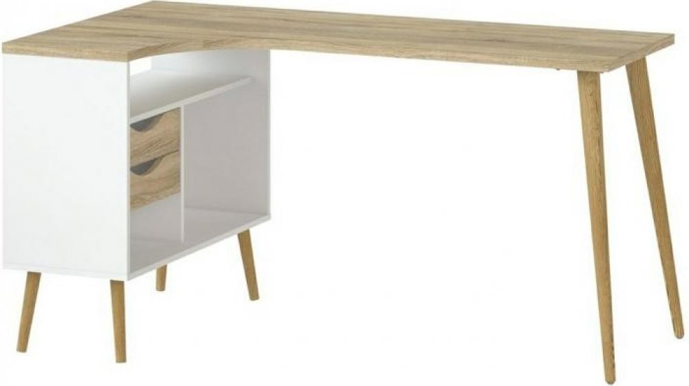 Stůl z této kolekce nabízí dostatek pracovní plochy a úložného prostoru, což ho činí praktickým pro různé místnosti, včetně dětských nebo studentských pokojů, kanceláří a domácích pracoven. Jeho vysoké šikmé nožky a obloukové výřezy místo úchytek dodávají tomuto stolu typický retro vzhled.