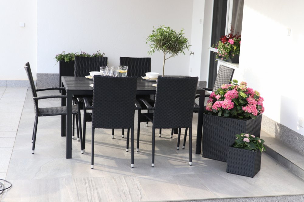 Sestava zahrnuje krásný a lehký stůl vyrobený z materiálů, které nevyžadují zvláštní údržbu. Konstrukce z hliníku ošetřeného proti rzi, deska stolu z Artwoodu a adaptéry u nohou pro větší stabilitu. Klasické tvary a černé provedení stolu.