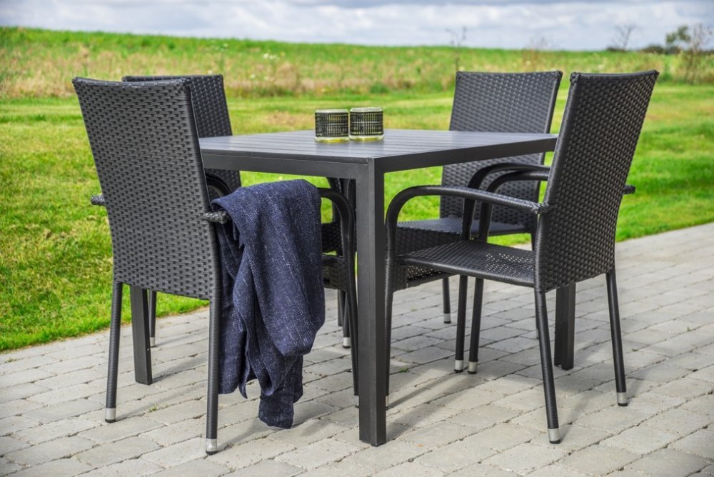 Sestava zahrnuje krásný a lehký stůl vyrobený z materiálů, které nevyžadují zvláštní údržbu. Konstrukce z hliníku ošetřeného proti rzi, deska stolu z Artwoodu a adaptéry u nohou pro větší stabilitu. Klasické tvary a černé provedení stolu. Jídelní stůl doplňují zahradní židle s ocelovou konstrukcí vypletenou umělým ratanem, které se hodí prakticky kamkoliv. Pro delší životnost byla ocel ošetřena proti rzi. Stohovatelné, bezúdržbové židle s vyztuženým sedákem, který unese těžší váhy i po delší dobu. Sestava je vhodná do venkovních i vnitřních prostor. 1x stůl Viking M Rozměry stolu: 74 x 90 x 90 cm (v x š x h) Hmotnost: 10 kg Materiál: hliníková konstrukce/artwood deska 4x židle Paris ratanová, stohovatelná Rozměry židle: 56 x 95 x 64 cm (š x v x h) Hmotnost: 5,2 kg Nosnost: 130 kg Materiál: umělý ratan/ocelový rám Set Viking M + 4x židle PARIS Druh výrobku sestava Balení obsahuje 1x stůl, 4x židle Název stolu Viking M Název židle Paris stohovatelná židle Počet balíků při dodání 2 - 3 Vhodné pro prostory interiér, exteriér Materiál ocel/ umělý ratan/ artwood/ hliník Výrobek je dodán v rozmontovaném stavu stůl Součástí dodávky je spojovací materiál a návod k montáži ano