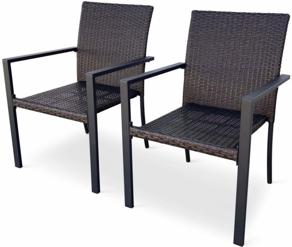 WICKER PAT - zahradní stohovací židle - sada dvou kusů Pohodlná a prostorná zahradní židle WICKER PAT s ocelovou konstrukcí a výpletem z umělého ratanu. Židli využijete samostatně nebo jako jídelní židli k zahradnímu stolu. Sedák a opěrku z umělého ratanu v tmavě hnědé barvě doplňují hranaté područky z kovu. Umělý ratan představuje velmi odolný materiál, který dobře snáší jakékoliv povětrnostní po...