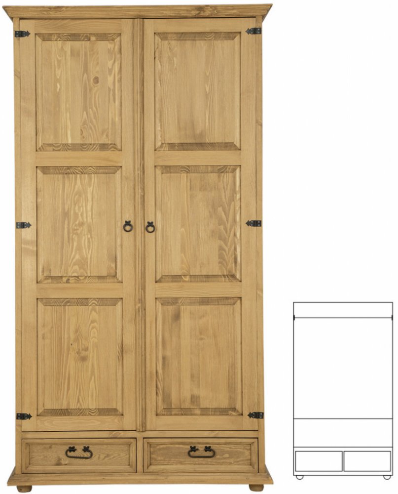 Šatní skříňNZL-SK701 perfektně zapadá do kolekce rustikálního nábytku a je nabídkou pro každého, kdo hledá netradiční nábytek z masivu. Rustikální design skříně spolu s kovovými prvky v podobě pantů a úchytek představuje vkusné řešení do každého interiéru. Použití masivního borovicového dřeva zaručuje vysokou odolnost a pevnost skříně. Šatní skříň po otevření nabídne široký prostor s šatní tyčí a spodním regálem. V dolní části skříně se nachází dvě praktické zásuvky. Veškerý nábytek kolekce Rustikal se vyznačuje vysokou kvalitou, dlouhou životností a příjemným designem. Použití přírodního dřeva spolu s precizním a detailním provedením nábytku zútulní váš interiér.