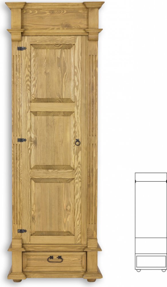 Šatní skříň NZL-SK807 - perfektně zapadá do kolekce rustikálního nábytku a je nabídkou pro každého, kdo hledá netradiční nábytek z masivu. Rustikální design skříně spolu s kovovými prvky v podobě pantů a úchytek představuje vkusné řešení do každého interiéru. Použití masivního borovicového dřeva zaručuje vysokou odolnost a pevnost skříně. Šatní skříň po otevření nabídne prostor s šatní tyčí a spodním regálem. V dolní části skříně se nachází praktická zásuvka. Veškerý nábytek kolekce Rustikal se vyznačuje vysokou kvalitou, dlouhou životností a příjemným designem. Použití přírodního dřeva spolu s precizním a detailním provedením nábytku zútulní váš interiér.