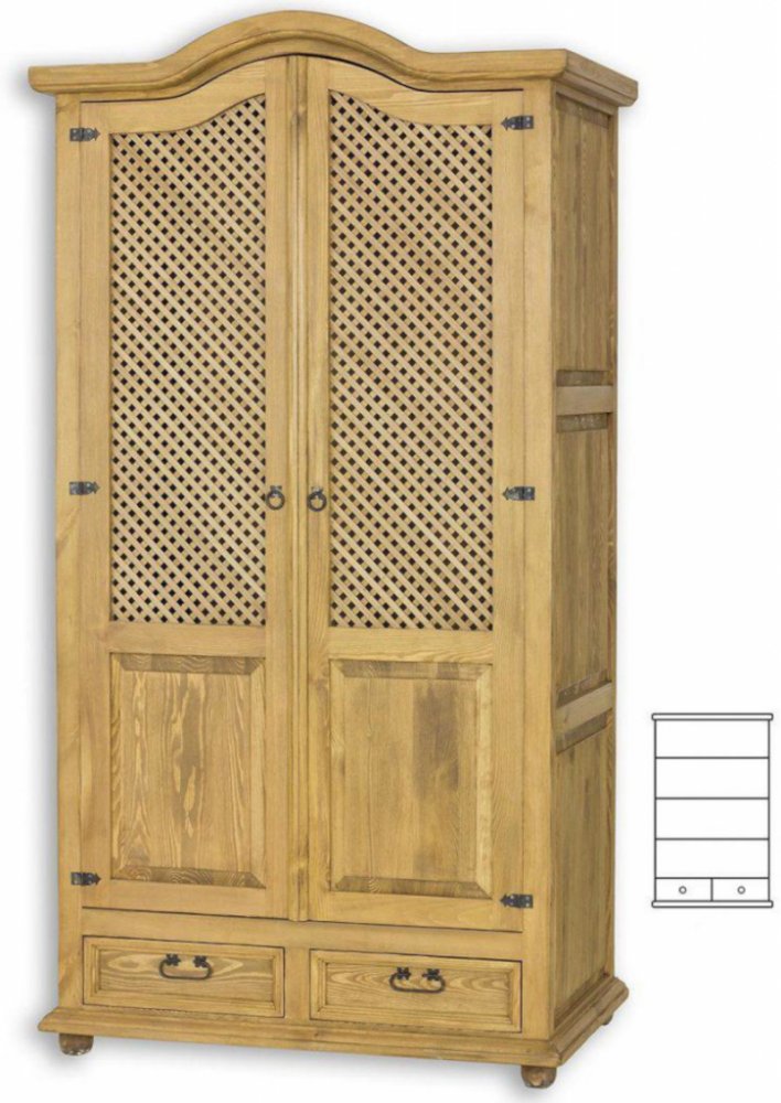 Šatní skříň SK849 perfektně zapadá do kolekce rustikálního nábytku a je nabídkou pro každého, kdo hledá netradiční nábytek z masivu. Rustikální design skříně spolu s kovovými prvky v podobě pantů a úchytek představuje vkusné řešení do každého interiéru. Použití masivního borovicového dřeva zaručuje vysokou odolnost a pevnost skříně. Šatní skříň zaujme mřížkou na dveřích, po otevření nabídne tři prostorné police. V dolní části skříně se nachází dvě praktické zásuvky. Veškerý nábytek kolekce Rustikal se vyznačuje vysokou kvalitou, dlouhou životností a příjemným designem. Použití přírodního dřeva spolu s precizním a detailním provedením nábytku zútulní váš interiér.