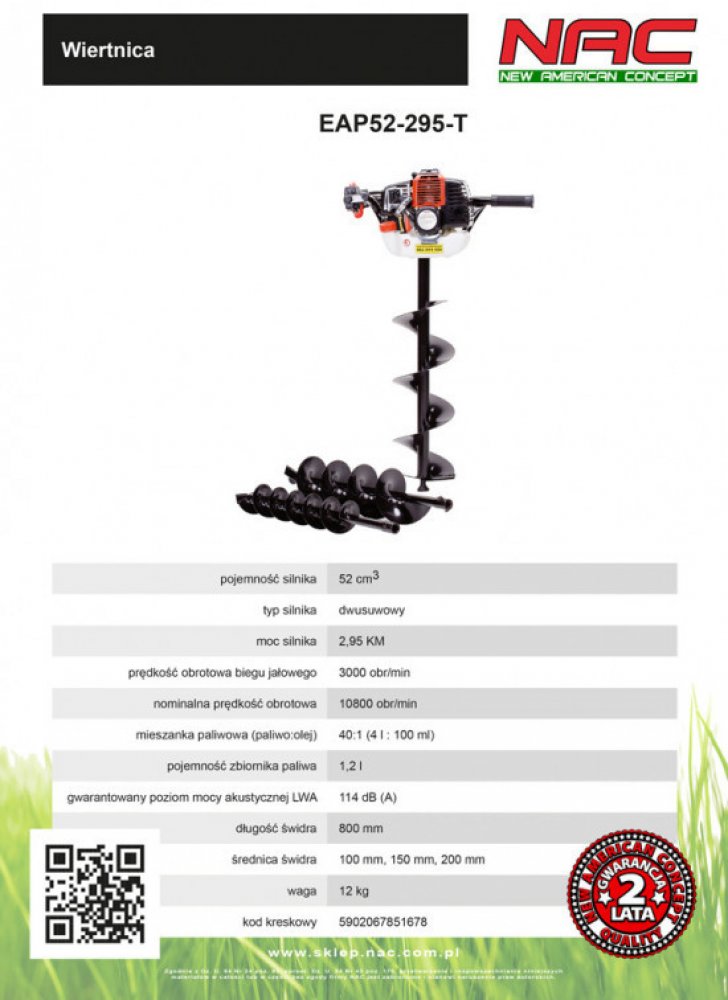 Zemní vrták NAC EAP52-295-T s výkonným dvoutaktním motorem o objemu 52 cm3 usnadní práci při vrtání otvorů do země. Skvěle se hodí pro zahradníky, farmáře i stavebníky, kteří potřebují rychle a efektivně osadit plot, vysadit stromy nebo připravit základy.