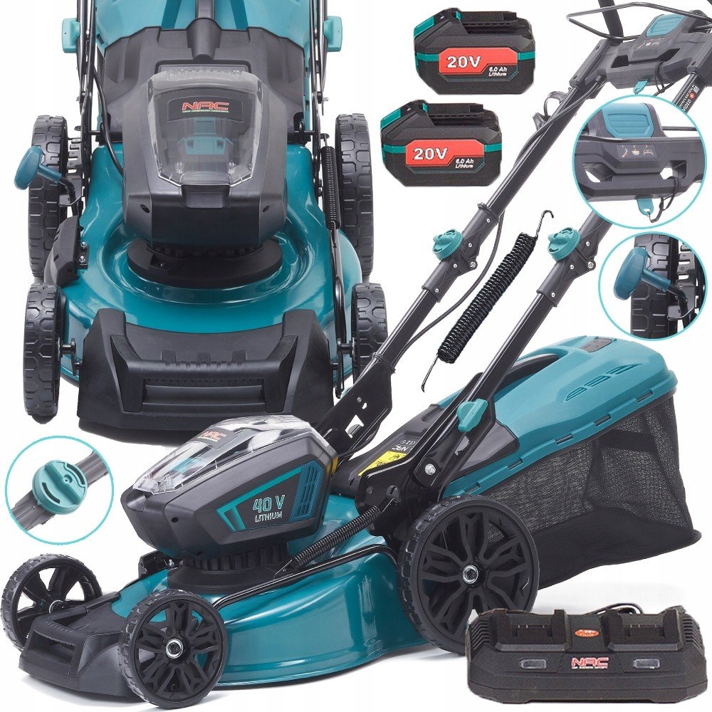 NAC 46 cm ocelové 27 kg bez pojezdu akumulátorové rotační 50 l 20 V 6 Ah elektromotor 2800 ot/min 75 mm 1 s plastovo-látkovým košem