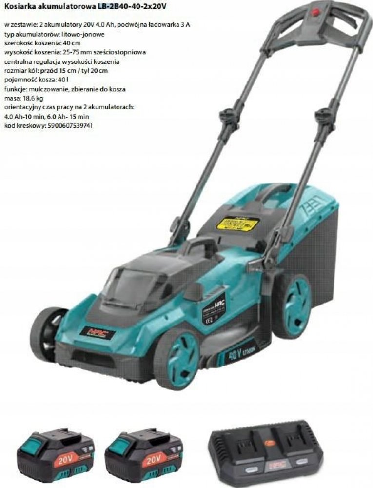 Aku sekačka, baterie 2x 20 V, funkce bočního a zadního výhozu, vyhazování do koše a mulčování. Sklápěcí rukojeti, nastavitelná výška sečení, ocelový kryt odolný vůči nárazu. Indikátor nabití baterie, použití i bez přístupu k elektrické síti.