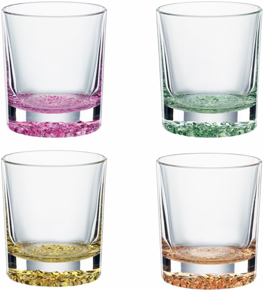 Sada obsahuje 4 sklenice LOUNGE 2 Color je ideální volbou na kvalitní whisky a další elegantní nápoje včetně nealkoholických. Každá sklenice má jinou barvu základny: ostružinovou, pomerančovou, barvu slunce a barvu klíčícího listu rostliny. Velice efektně působí s koktejly na čiré bázi se sodou a ledem