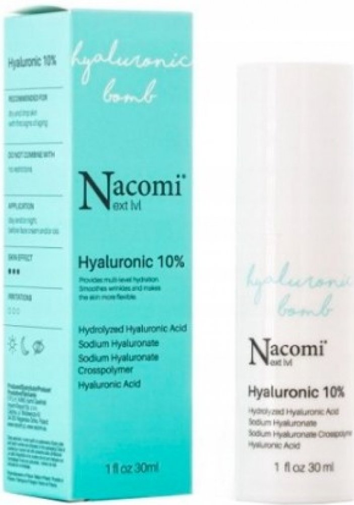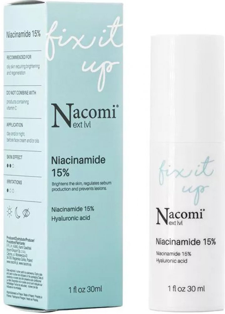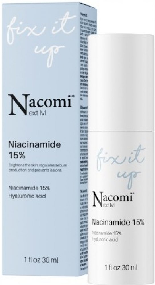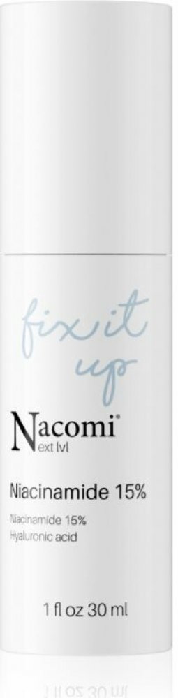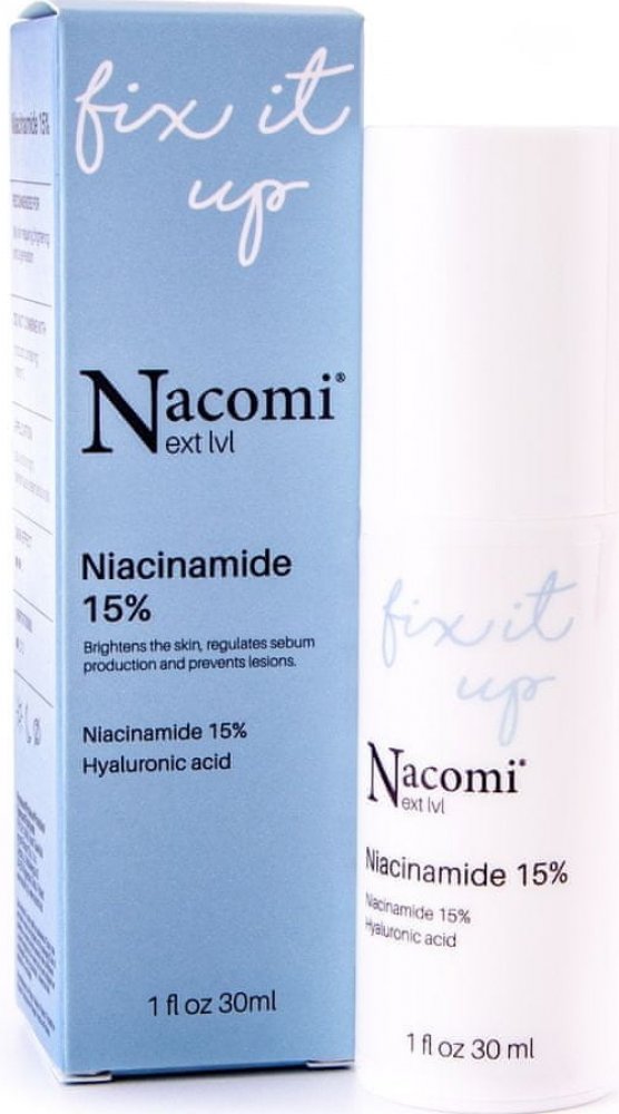 Nacomi - Next Level - Niacinamide 15 % - sérum obsahuje niacinamid, který reguluje sekreci kožního mazu, urychluje hojení zánětů a redukuje pigmentové skvrny. Přípravek byl dále obohacen o šťávu z aloe vera a panthenol, které hydratují a zklidňují podráždění a zarudnutí a kyselinu hyaluronovou ve 4 formách, která váže vodu v pokožce a zajišťuje dostatečnou úroveň hydratace.