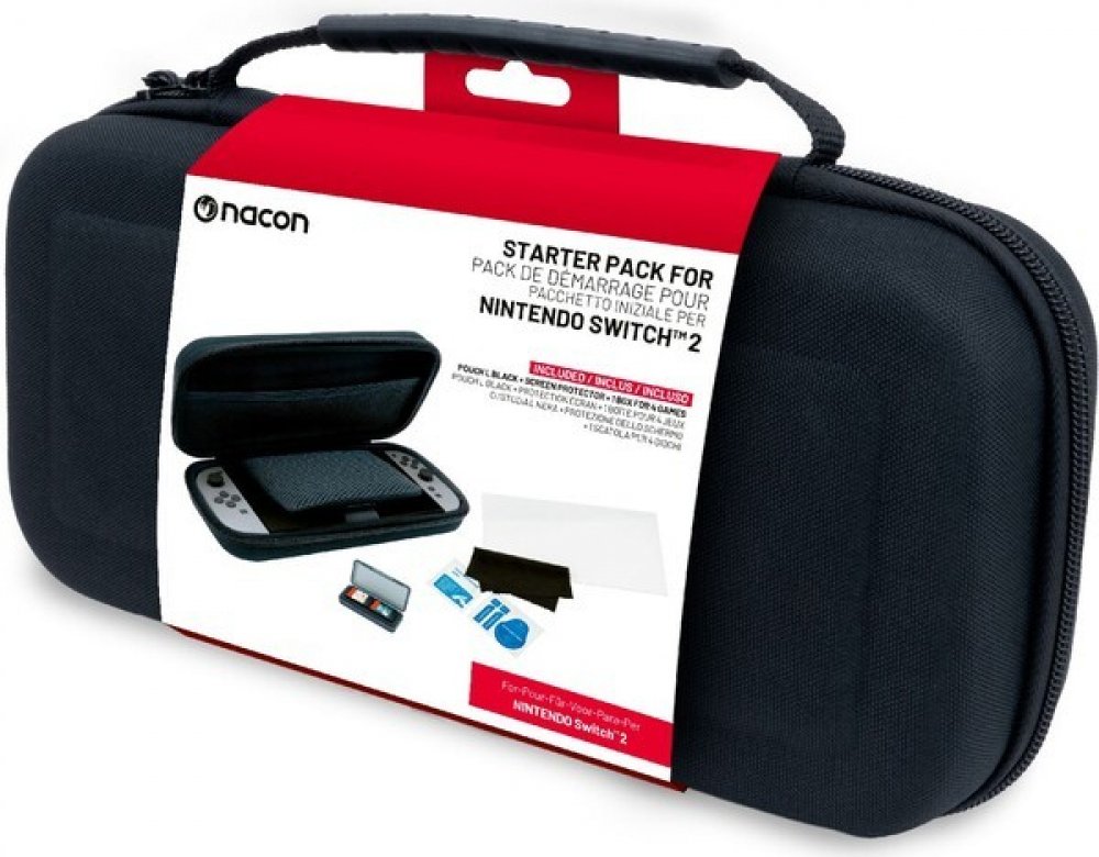 Startovací sada SWITCHNEWPACK5BLACK Tato sada příslušenství od společnosti Nacon určená pro herní konzoli Nintendo Switch 2 obsahuje pevné přepravní pouzdro, tvrzené ochranné sklo a praktické pouzdro pro uložení dalších herních karet. • Pevné přepravní pouzdro: - Pojme konzoli včetně připojených ovladačů Joy-Con 2. - Polstrovaný oddělovač chrání obrazovku konzole před poškrábáním. - Síťovaná kapsa pro nezbytné příslušenství. - Tři kapsičky pro herní karty na pásku držícím konzoli na místě. - Provedení pouzdra a kvalita použitých materiálů zajišťují ochranu konzole před poškozením. - Díky vyjímatelnému mezidnu kompatibilní rovněž s konzolemi Nintendo Switch, Switch Lite a Switch – OLED Model. • Tvrzené ochranné sklo: - Špičková ochrana obrazovky díky tvrdosti skla stupně 9H při tloušťce 0,45 mm. - Křišťálově čistý obraz, nízká míra odlesků, odolné proti otiskům prstů, poškrábání i nárazu. - Nebrání v dotykovém ovládání konzole. - Součástí balení je čisticí hadřík, dva dezinfekční vlhčené ubrousky, dvě lepítka pro odstranění prachu a nálepky usnadňující aplikaci skla. • Pouzdro pro uložení herních karet: - Oboustranné zavírací pouzdro pro uložení až čtyř herních karet. - Ideální, když si chcete vzít na cestu větší počet svých oblíbených her.