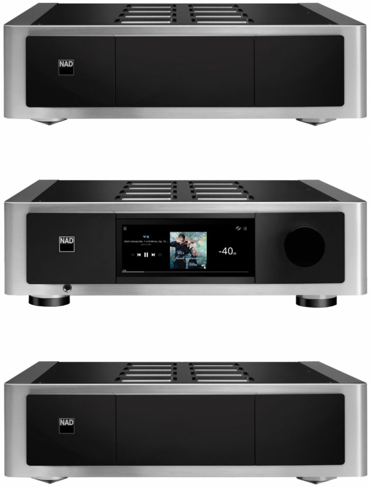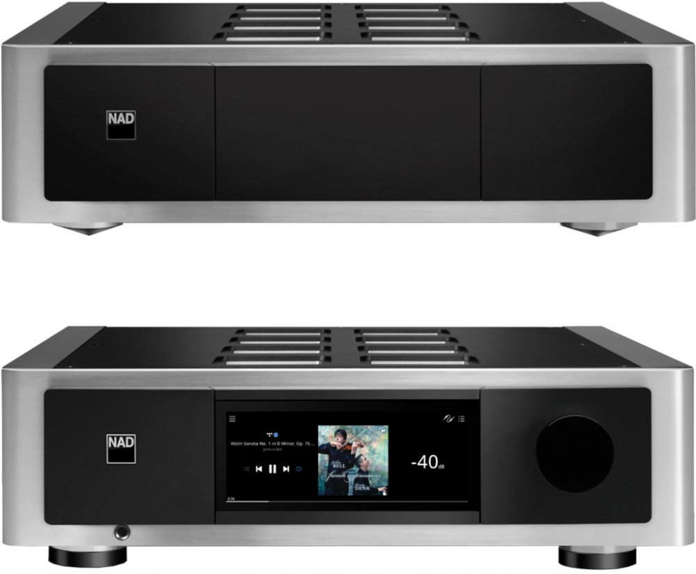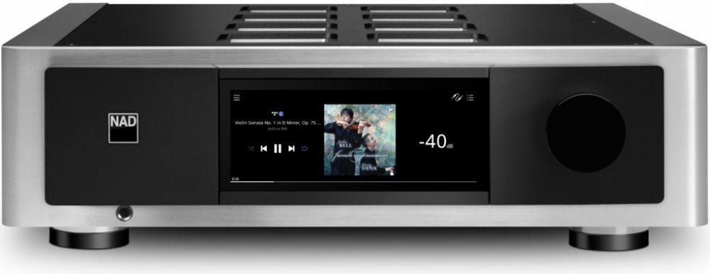 Můžete mít přístup k veškeré hudbě, která kdy byla nahrána – tento prvotřídní BluOS streamer vám dovolí hudbu přehrávat i ovládat jednoduše a pohodlně z mobilu, tabletu nebo počítače. Skvěle nastaveno Díky síťovému streameru založenému na platformě BluOS je intuitivním kamarádem se širokým spektrem možností. M66 neodolá hudbě, která byla nahrána a dodává ji v rozlišení až 24 bit / 192 kHz. Aplikace v češtině je malým bonusem, jak vše zvládnout bez potíží a rychle. Funkčnost Tento špičkový multifunkční komponent spojuje vlajkový DA převodník ESS Sabre multiroomový BluOS síťový streamer s vysokým rozlišením s nejvyspělejším předzesilovačem. Výrobce do něho implantoval funkci korekce akustiky místnosti Dirac Live a Dirac Live Bass Control pro kalibraci připojených subwooferů. Nechybí řada vstupů pro analogové i digitální zdroje signálu, včetně PHONO MM / MC, HDMI ARC nebo AES/EBU. K dispozici jsou také výstupy symetrické XLR i nesymetrické Cinch pro zesilovač a 4 subwoofery. Dva rozšiřující sloty MDC2 z něj činí prvotřídního partnera pro koncový zesilovač M23. Již žádné kompromisy Jde o komponent ze série Masters, respektive vrchol technických možností a umu s cílem dosáhnout ve dvoukanálovém předzesilovači toho nejlepšího. Existuje také množství vstupů včetně MM/MC vstupu pro gramofon a HDMI eARC pro připojení TV, zařízení hostí též platformu BluOS s desítkami podporovaných hudebních služeb a ovládacích aplikací v češtině. Pohledný model Vývojáři navrhli odvážné hliníkové šasi s živým 7-palcovým dotykovým displejem, čímž se M66 stává ideálním partnerem k oceňovanému zesilovači NAD Masters M23 či k jinému koncovému zesilovači. Inovativní Dynamic Digital Headroom obvod eliminuje zkreslení digitálních špiček, vlajkové DAC a ADC čipy od ESS Technology se širokým dynamickým rozsahem a minimálním zkreslením doplňují mozaiku, týkající se tohoto skvělého zařízení. BluOS síťový streamer s vysokým rozlišením a možností multiroom přehrávání plus bohatý výběr analogových i digitálních vstupů dávají jasně najevo, že tato volba je správná. K dispozici je gramofonový MM/MC předzesilovač s infrazvukovými filtračními obvody, dedikovaný sluchátkový zesilovač se 6.35 mm jackem na předním panelu, podpora přehrávání přes Apple AirPlay 2, Spotify Connect a Tidal Connect. Platí plná hardwarová podpora MQA dekódování a vykreslování. Přehlídka možností Analogové signály jsou standardně konvertovány na digitální, s cílem zajistit funkce Dirac Live Room Correction a Bass Control. K tomu všemu přistupuje režim Analogue Direct, který obchází všechna digitální zpracování, načež využívá oddělené signálové cesty pro analogové a digitální zdroje. Je jasné, že obě sekce jsou fyzicky oddělené, navzájem stíněné, využívají vlastní napájecí zdroje, a tudíž digitální rušení je minimální. Jako první stereo komponent je vybaven čtveřicí symetrických (XLR) a čtyř nesymetrických (RCA) výstupů pro subwoofery. Spojením s M23 vznikne systém, který vyniká nejenom technologicky, ale i zvukově a vizuálně. Díky špičkové technologii zesílení Purifi Audio Eigentakt je průzračně čistá reprodukce audia nastartována, nejsou vynechány ani ty nejmenší detaily. Velká výkonová rezerva zaručuje spolupráci i s nejnáročnějšími reproduktory. Technická specifika Možné ovládání displejem, ovladačem hlasitosti na předním panelu uzavírá možnost použít přidané IR dálkové ovládání, BluOS aplikace (iOS, Android, MacOS, Windows), Amazon Alexa, Google Assistant, Apple AirPlay 2 s podporou Siri, Spotify Connect, Tidal Connect, Roon Ready, Crestron, Control4, ELAN, RTI, URC. Tento velmi zdařilý a oceňovaný produkt NAD vyrábí v černém nebo stříbrném kabátku.