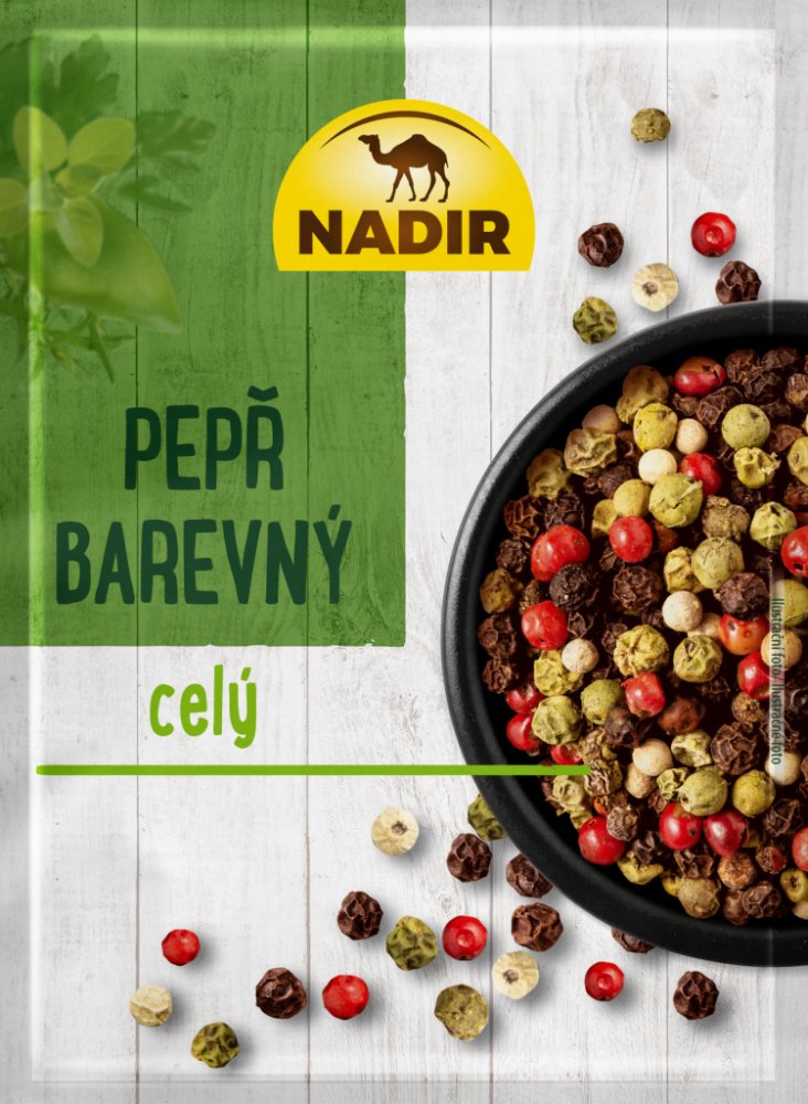 Nadir pepř barevný celý.Složení: pepř černý celý, pepř bílý, pepř zelený celý, pepř červený celý.Může obsahovat lepek, vejce, mléko, sóju, hořčici, celer a arašídy.VýrobcePěkný-Unimex s.r.o., Trojanova 16, 120 00 Praha 2, Česká republika;