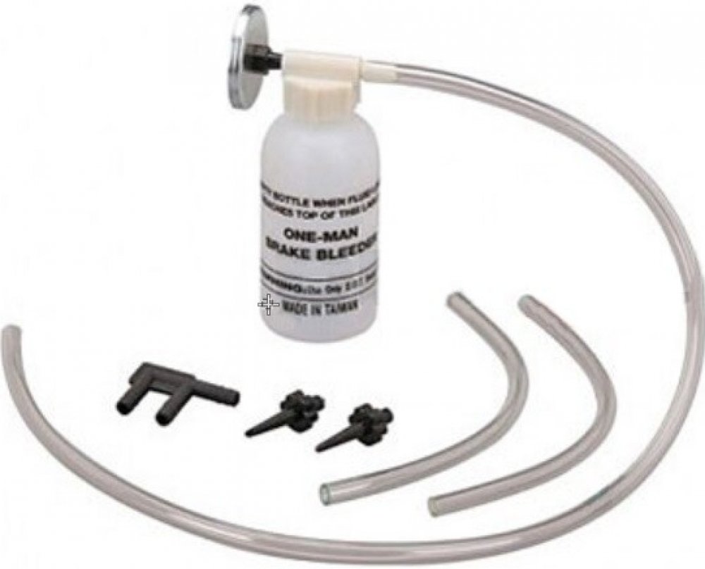 Nádobka na odvzdušňování brzd jedním mechanikem Účelnou sadu pro odvzdušňování brzd jen jedním mechanikem tvoří speciální plastová nádobka pro brzdovou kapalinu, 3 umělohmotné hadičky a 3 připojovací adaptéry. Nádobka je opatřena silným magnetem, takže ji lze snadno upevnit na běžný kovový povrch.