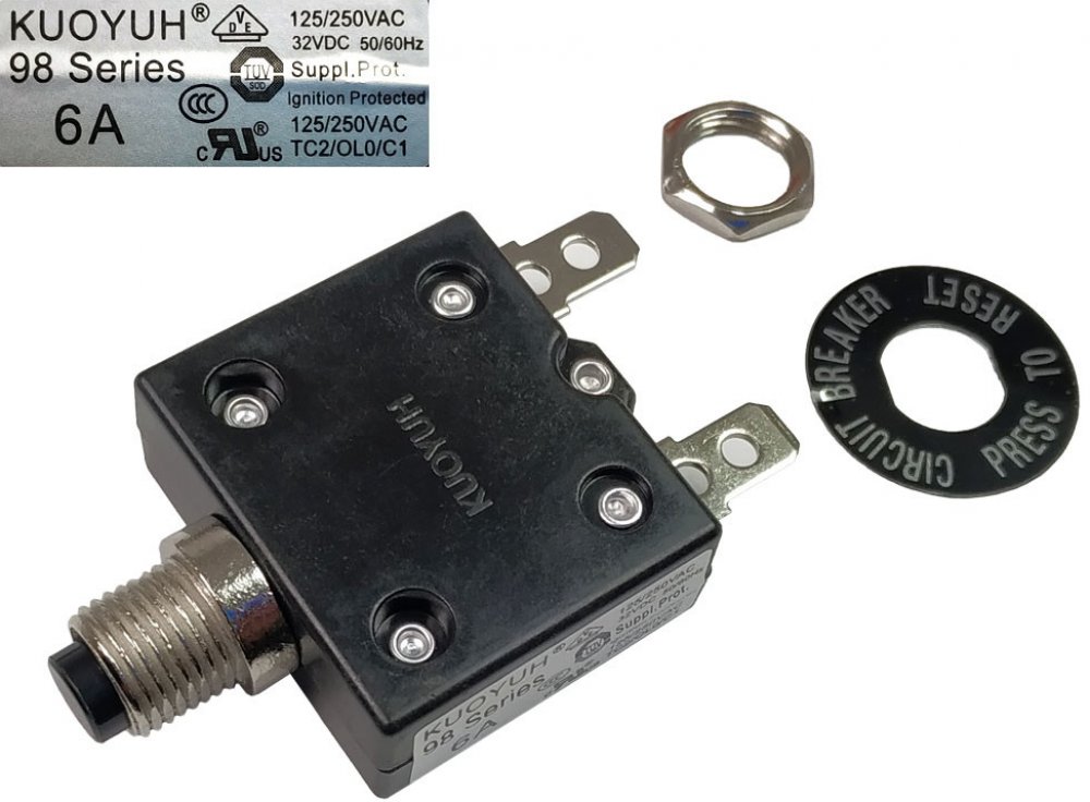 Jistič nadproudu, teplotní jistič, tepelná pojistka, teplotní pojistka Tepelný jistič s manuálním resetem. Jedná se o vratnou ochranu (jistič) například motorů, jistič v případě delšího / trvalého přetížení rozpojí obvod.Vypíná po 25-30sec. při zatížení jmenovitým proudem navýšeným o 10%. S narůstajícím proudem se doba vypnutí zkracuje.