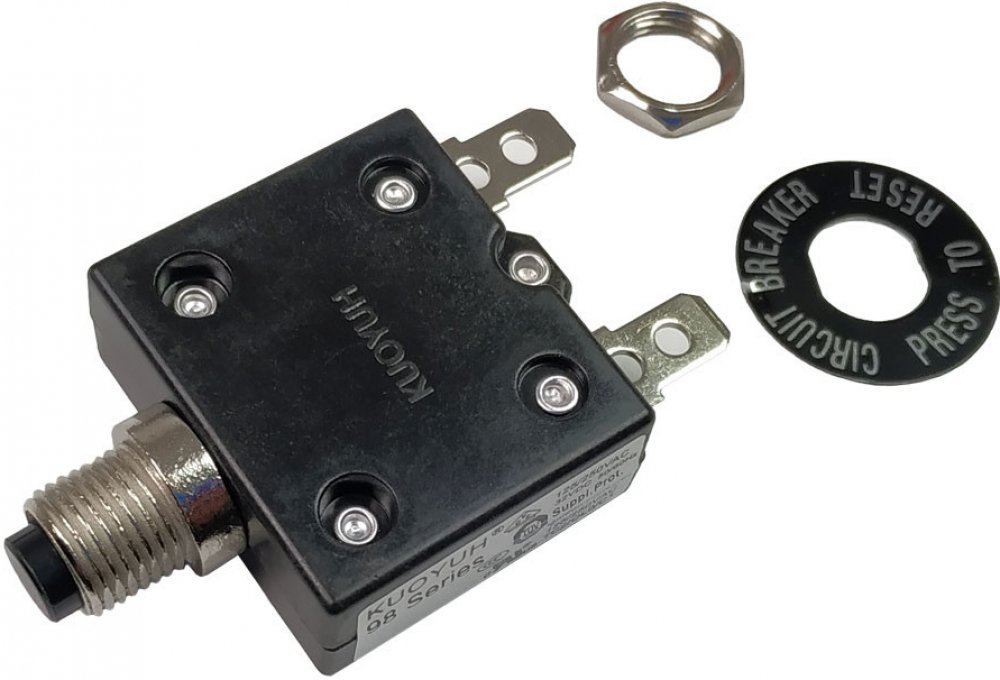 Jistič nadproudu, teplotní jistič, tepelná pojistka, teplotní pojistka Tepelný jistič s manuálním resetem. Jedná se o vratnou ochranu (jistič) například motorů, jistič v případě delšího / trvalého přetížení rozpojí obvod.Vypíná po 25-30sec. při zatížení jmenovitým proudem navýšeným o 10%. S narůstajícím proudem se doba vypnutí zkracuje.