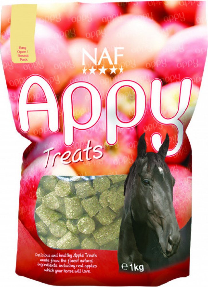 NAF Appy Treats jsou přírodní pamlsky, které kombinují pouze ty nejlepší vlastnosti jablek spolu s dalšími čistě přírodními surovinami. Nyní můžete svému koni kdykoliv nabídnout zdravý a chutný pamlsek.