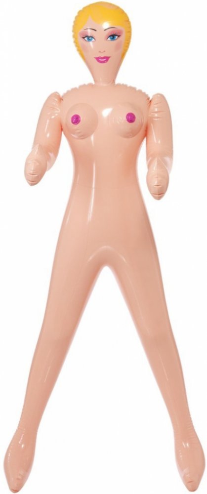 Nafukovací panna s natištěnou tváří v životní velikosti! Leží a má jednu nohu do vzduchu kvůli snadnému průniku. Má tři otvory (anál, vagína, orál).