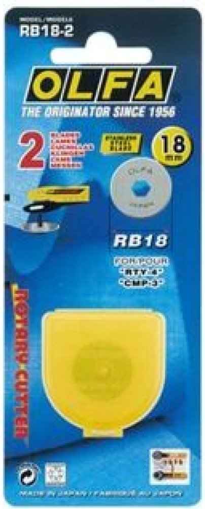 Náhradní čepel RB18 pro kruhovou řezačku OLFA (2ks) Náhradní kulatá čepel pro kruhovou řezačku CMP-3 OLFA s průměrem nože 18 mm. Čepel je vhodná také pro rotační řezač RTY-4. Balení obsahuje 2 kusy čepelí. UPOZORNĚNÍ: Nůž je extrémně ostrý. Udržujte mimo dosah dětí!