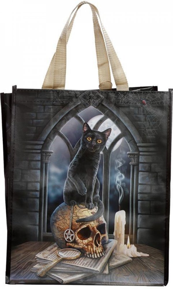 Ekologická velká nákupní taška s magickou kočkou. pentagramem a lebkou. V designu autorky Lisy Parker.